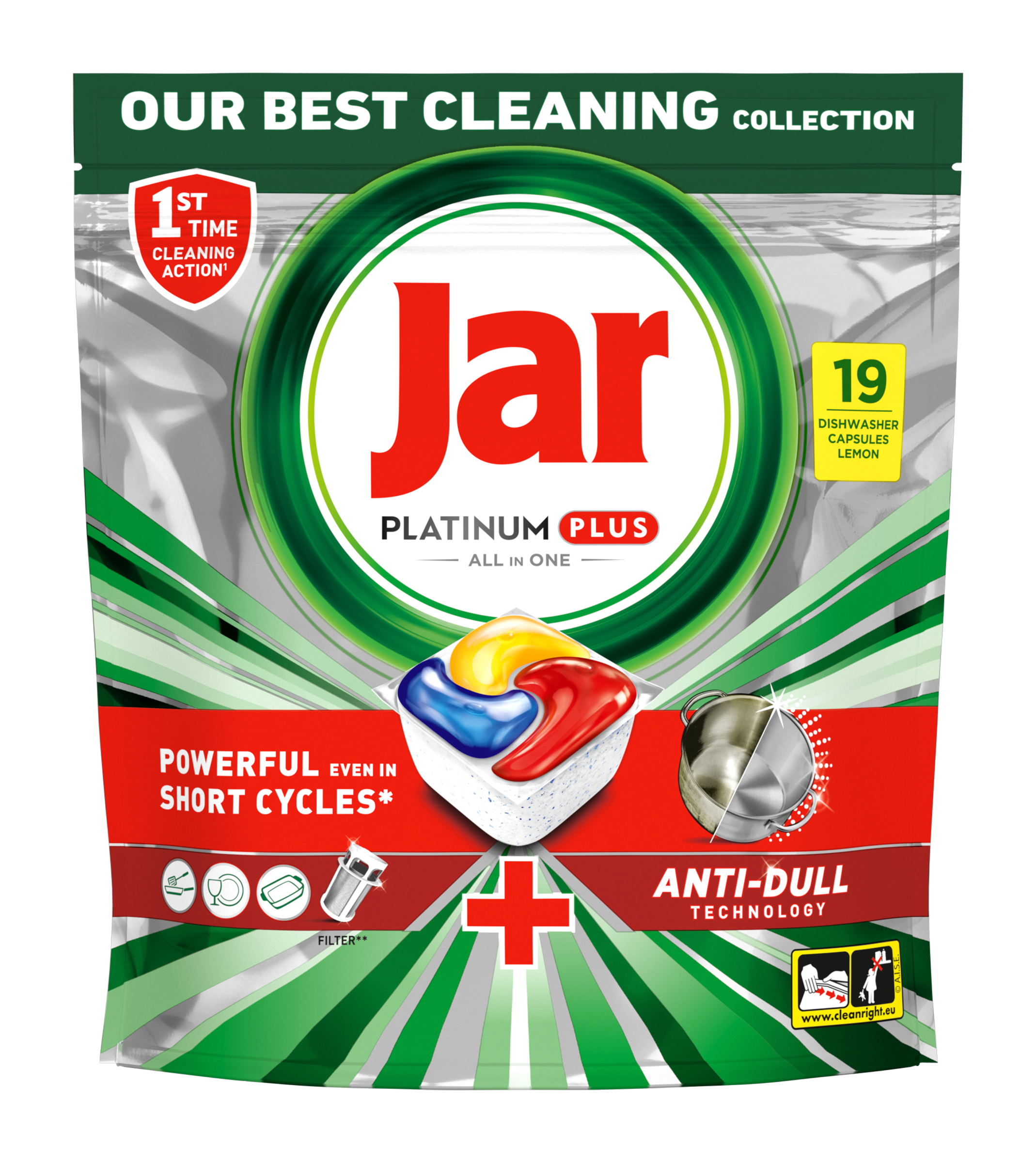 Kapsle do myčky na nádobí Jar Platinum Plus All In One zajistí dokonalou čistotu a obnoví původní lesk vašeho nádobí. Tyto výkonné mycí kapsle kombinují tekutý a práškový čisticí prostředek, který si poradí i s odolnými zbytky jídla a odstraní zašedlost vznikající časem. Díky rychle rozpustnému obalu působí okamžitě, takže jsou ideální i pro krátké mycí cykly. Navíc není třeba kapsli rozbalovat, stačí ji vložit přímo do přihrádky myčky a spustit program. Přepnutí na krátký režim šetří čas, energii i vodu, aniž by se snížila účinnost mytí.