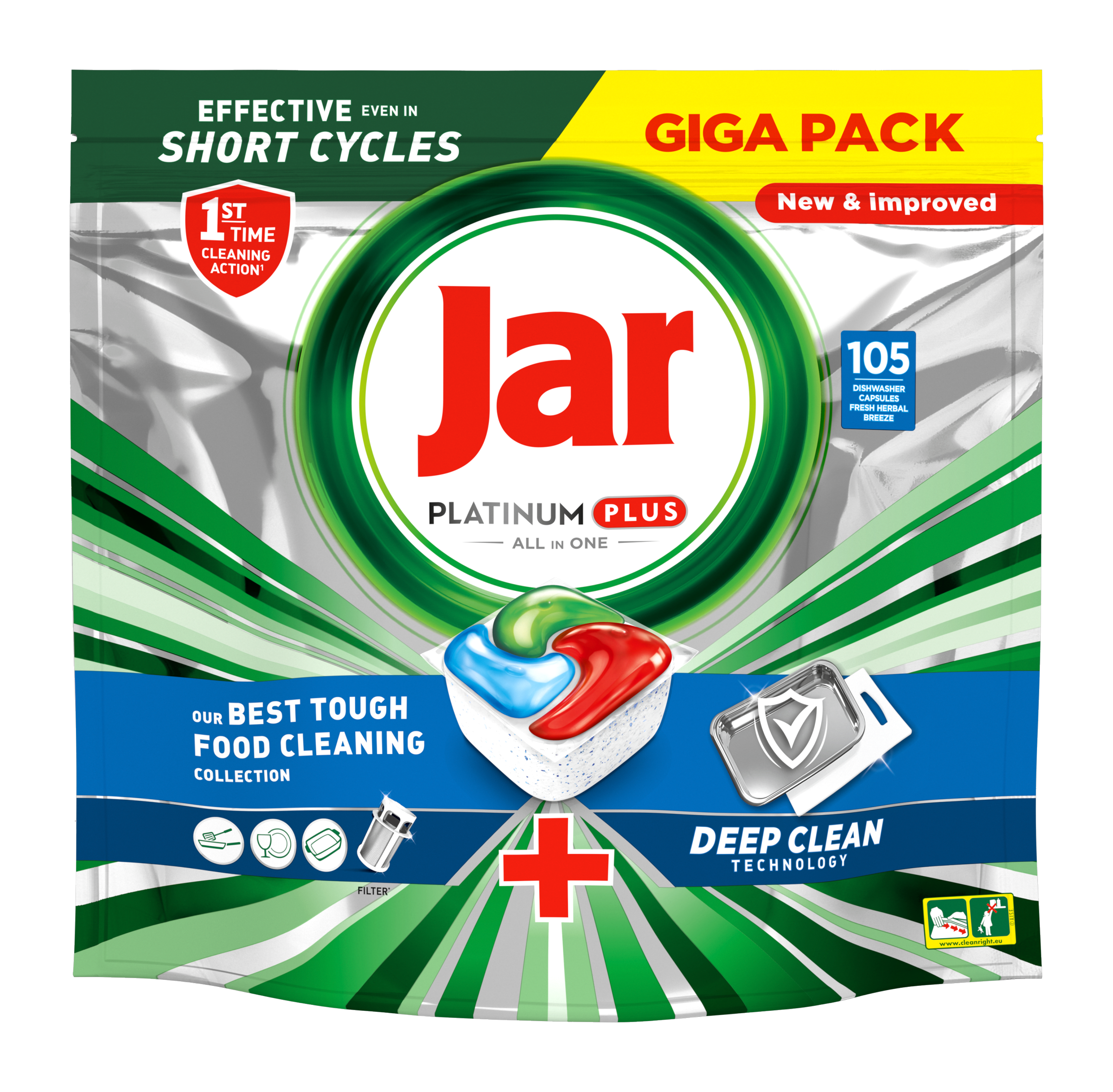 Tablety do automatické myčky nádobí Jar Platinum Plus All in One zanechávají nádobí čisté jako nové a mají nejlepší čisticí účinky z kolekce Jar na odolné zbytky jídla. Jar Platinum Plus poskytuje vynikající čistotu a odstraňuje odolné skvrny od jídla i v podmínkách krátkého cyklu. Pokud tedy máte málo času, nic se neděje. Přepněte na krátký režim. Jar v sobě slučuje tekutý i práškový čisticí prostředek v jedné účinné kapsli. Vysoce rozpustný obal se rychle rozpouští a funguje dobře i při krátkých cyklech, protože nádobí se začíná ihned umývat. A navíc se kapsle tak snadno používají! Kapsli není třeba rozbalovat a stačí ji jen vložit do přihrádky myčky na mycí prostředek. Přepněte na krátký cyklus a ušetřete oproti běžnému standardnímu cyklu čas, energii a vodu!