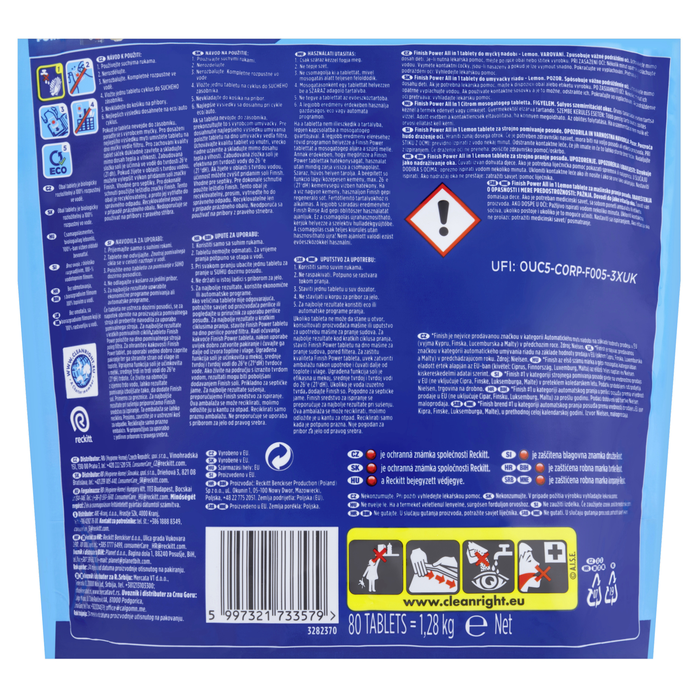 Varování: Finish Power All in 1 kapsle do myčky nádobí - Lemon. VAROVÁNÍ. Způsobuje vážné podráždění očí. Uchovávejte mimo dosah dětí. Je-li nutná lékařská pomoc, mějte po ruce obal nebo štítek výrobku. PŘI ZASAŽENÍ OČÍ: Několik minut opatrně vyplachujte vodou. Vyjměte kontaktní čočky, jsou-li nasazeny a pokud je lze vyjmout snadno. Pokračujte ve vyplachování. Přetrvává-li podráždění očí: Vyhledejte lékařskou pomoc. Nekonzumujte. Při požití vyhledejte lékařskou pomoc.