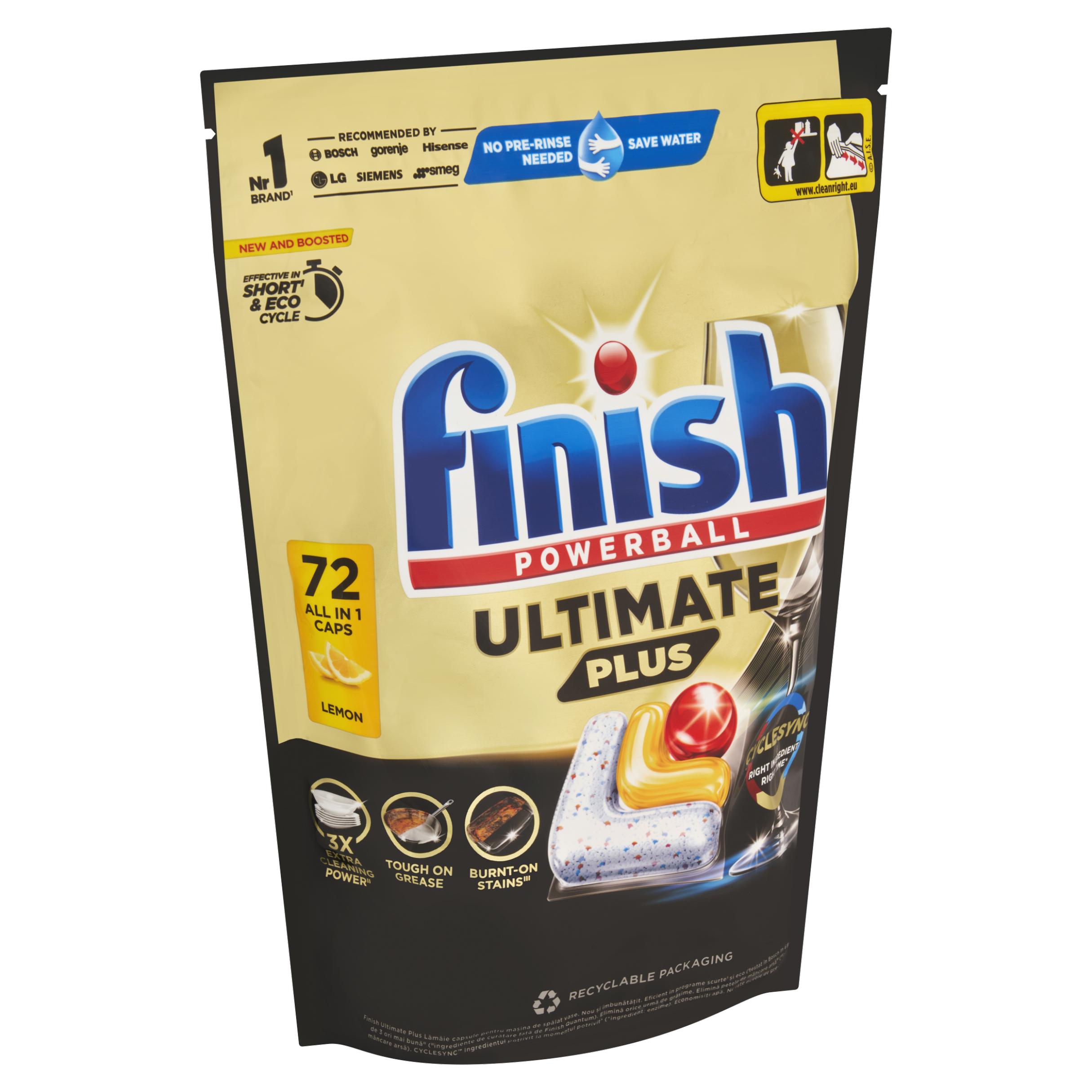 Pokročilé složení si poradí i s odolnými skvrnami bez nutnosti předmývat a přináší 4 akce v průběhu celého mycího cyklu. Kapsle chrání a pečují o skleněné nádobí a příbory a udržují jejich lesk s každým mytím. Náš revoluční výkon s o 15 % nižší hmotností chemikálií v porovnání s tabletami Finish Power All in 1.