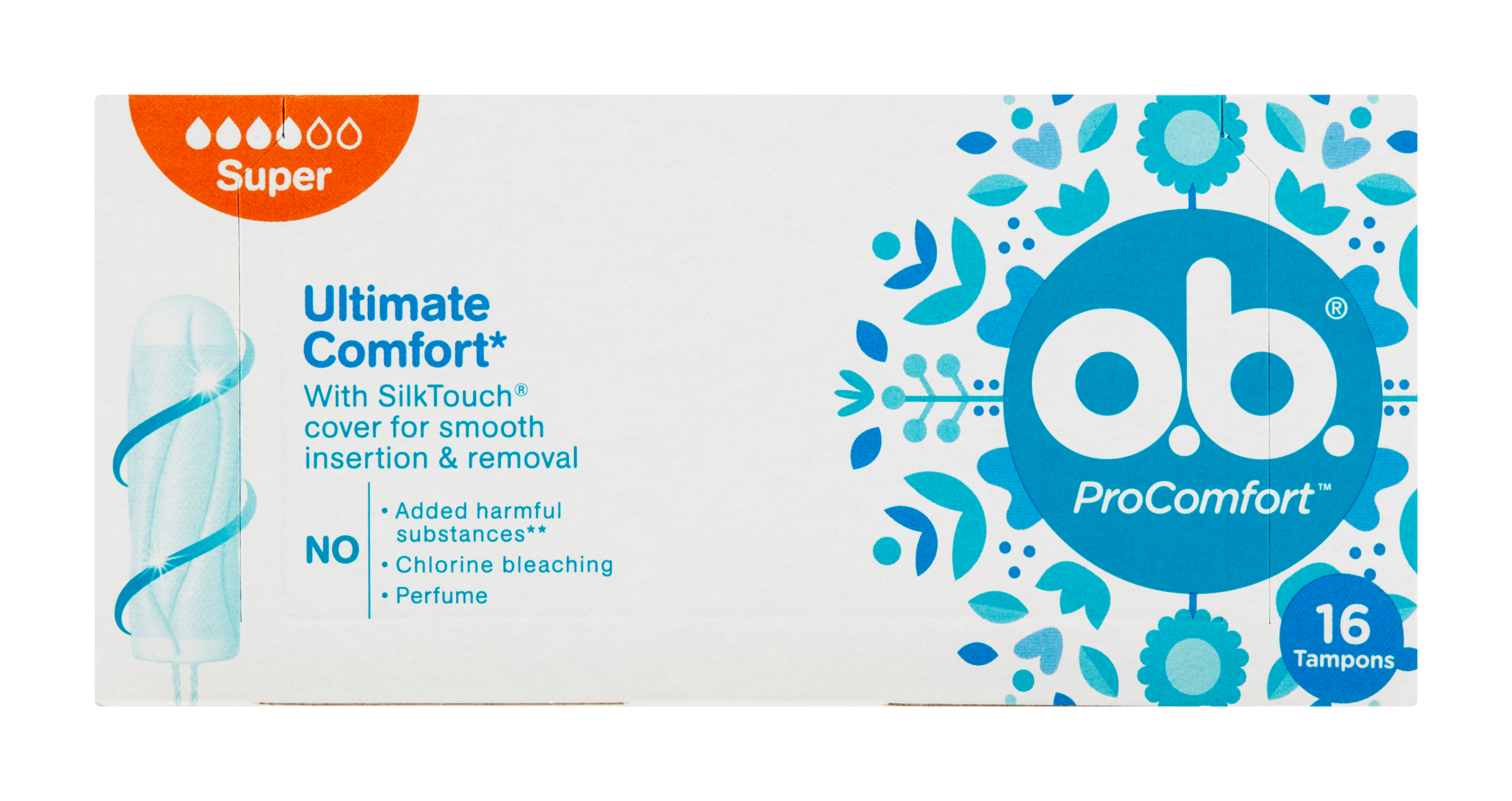 Nové tampony o.b.® ProComfort™ pro maximální pohodlí* a spolehlivou ochranu. Díky technologii Dynamic Fit™ s 3D expanzí se tampon přizpůsobí tvaru těla a pomocí zámkových drážek je tekutina účinně vedena do horní části tamponu. S povrchem SilkTouch™ pro snadné zavádění tamponů.