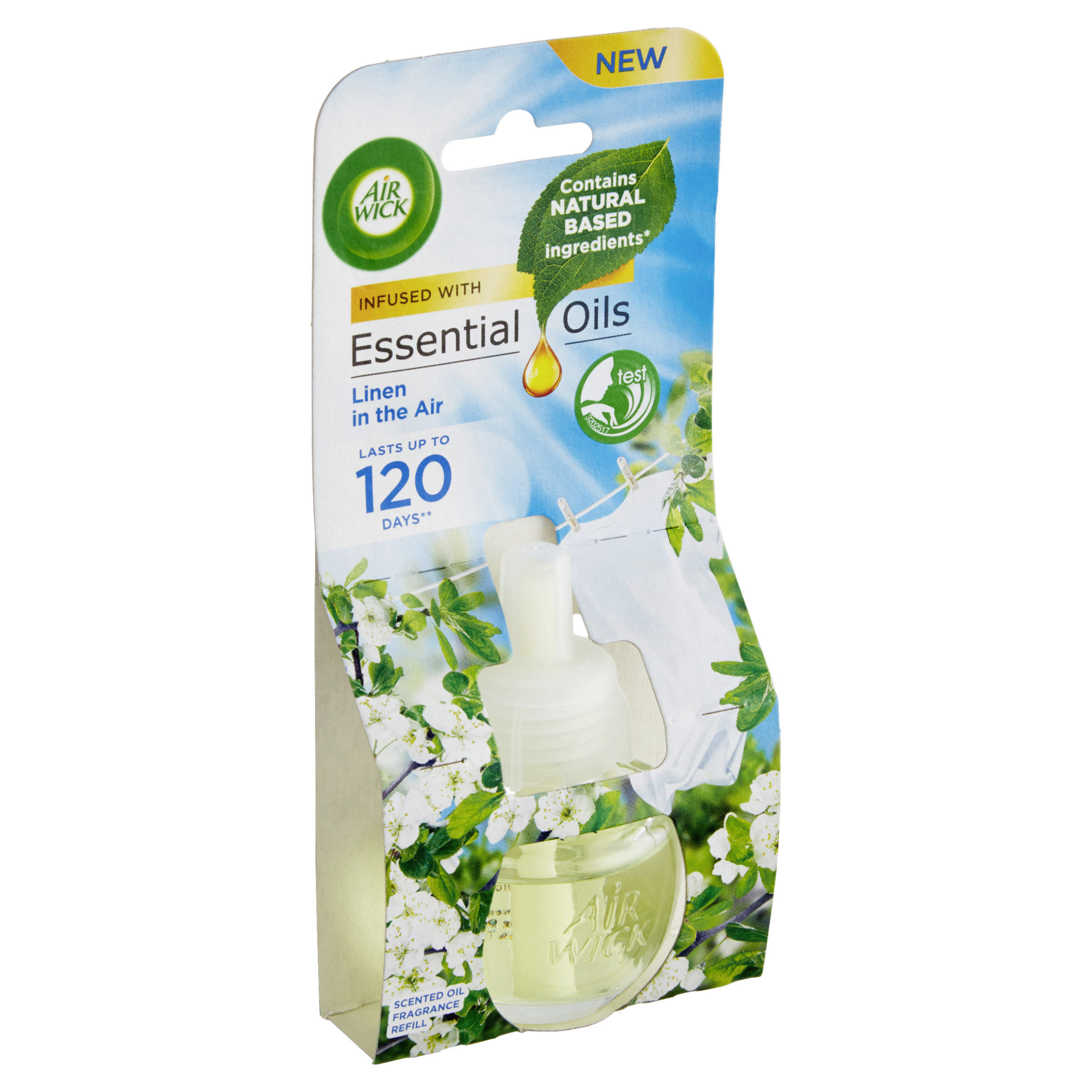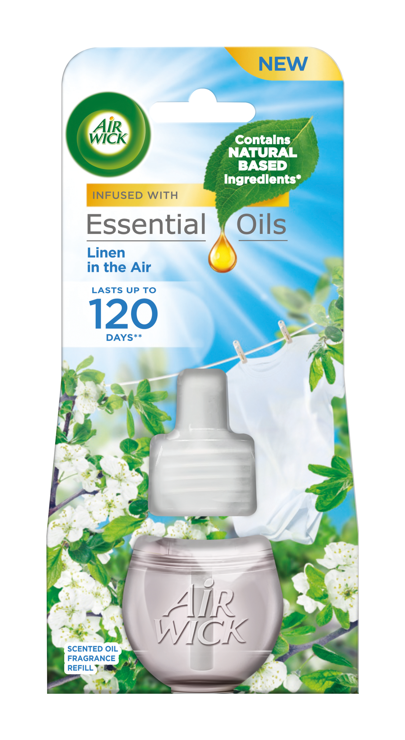 Nové složení s vonnými oleji obsahuje složky na přírodní bázi* a je obohaceno o přírodní esenciální oleje, které byly vytvořeny tak, aby vám přinesly autentický zážitek z vůně. Představte si vůni čerstvě vypraného prádla vanoucího ve vánku plném svěží vůně květů jabloně, pomerančovníku a jemné bavlny. Provoňte svůj domov vůněmi inspirovanými přírodou a vytvořte si hřejivou a příjemnou atmosféru. Baleno bez plastů. Nově jsou všechna balení Air Wick Scented Oils v ekologickém papírovém balení bez plastu.