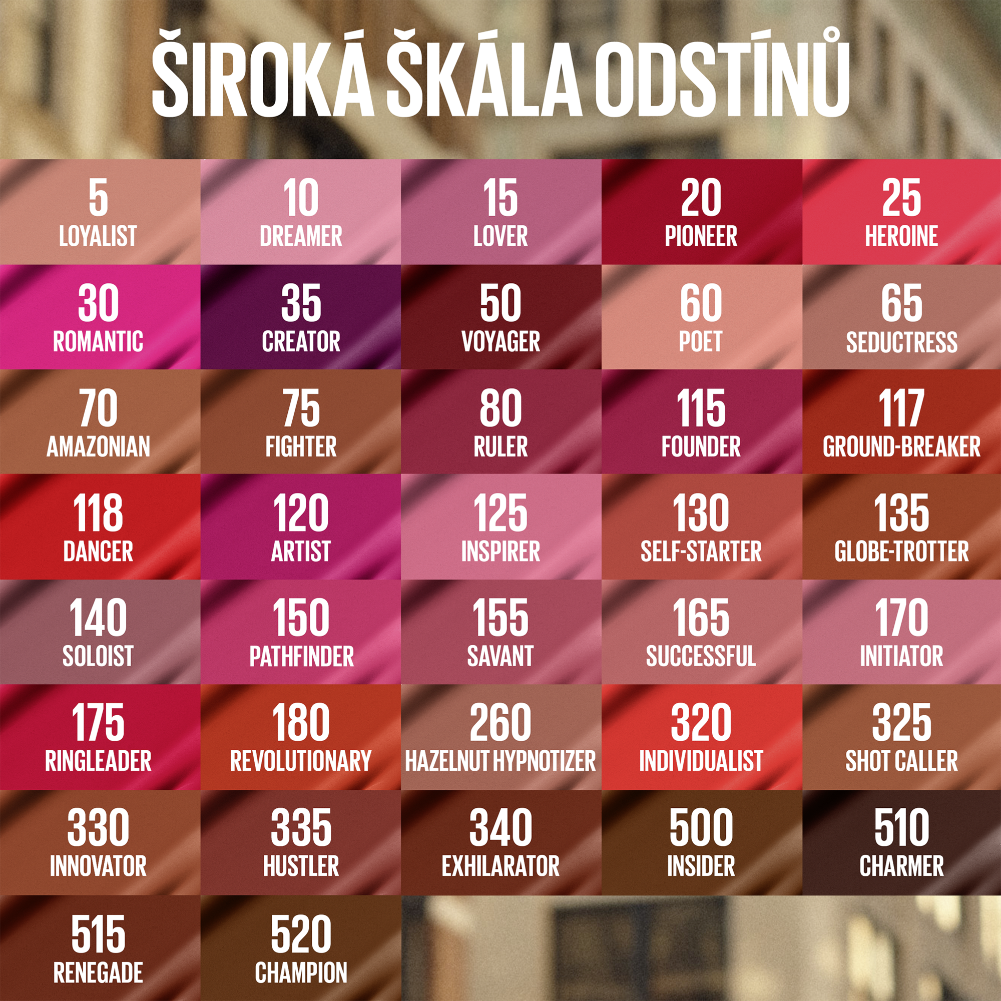Propůjčte svým rtům skutečně intenzivní barvu na celých 16 hodin! Matná tekutá rtěnka Maybelline SuperStay Matte Ink™ zbarví vaše rty sytým odstínem se sametově matným finišem. Výrazná a dlouhotrvající rtěnka Maybelline Matte Ink je součástí City Edition a inspirovaná městem New York a jeho stylem, který se neomrzí. Tuhle rtěnku zkrátka nelze nemilovat!