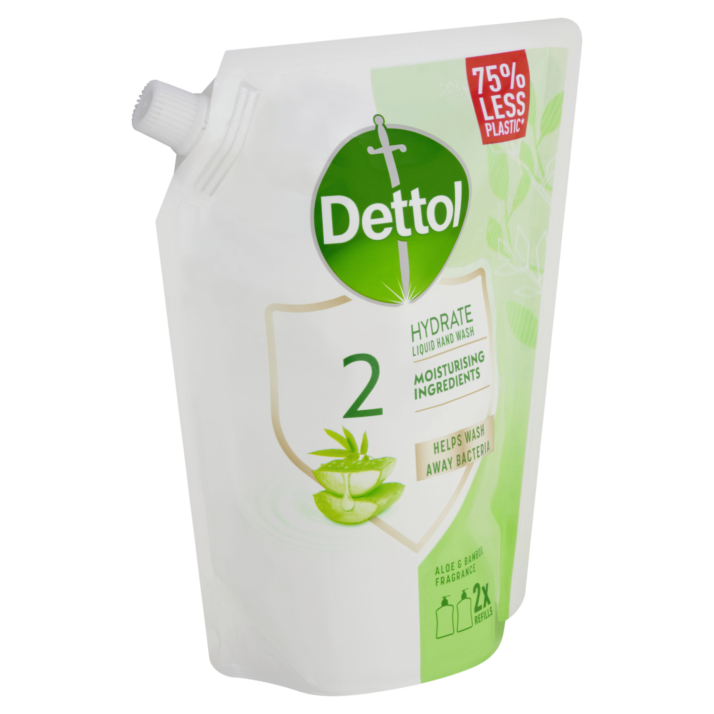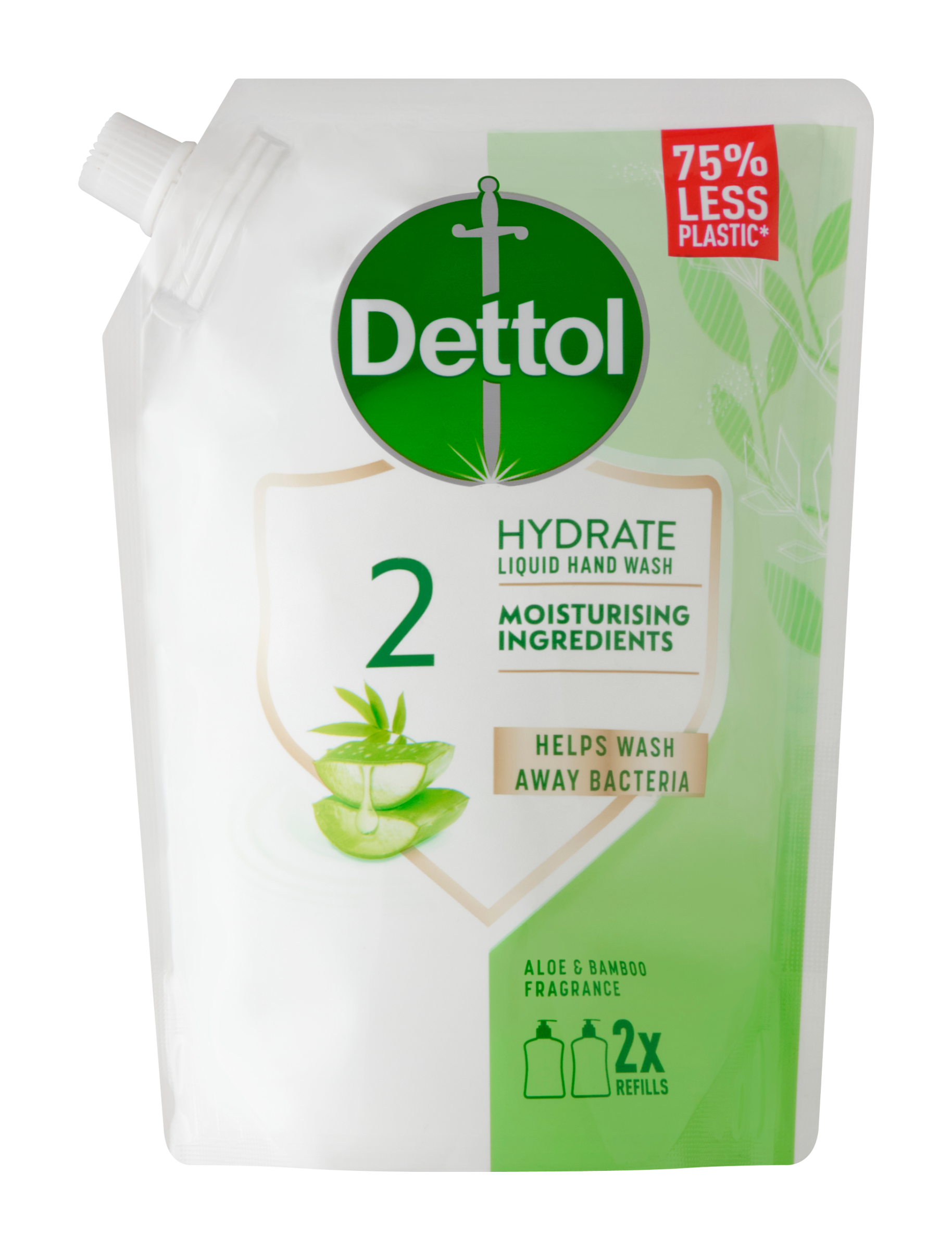 Dettol tekuté mýdlo Aloe & Bambus je obohacené o 2 hydratační složky, glycerin a kyselinu mléčnou, které pomáhají udržovat přirozené pH pokožky. Obsahuje o 75 % méně plastu vs. 2 lahvičky na Dettol tekuté mýdlo o objemu 250 ml.