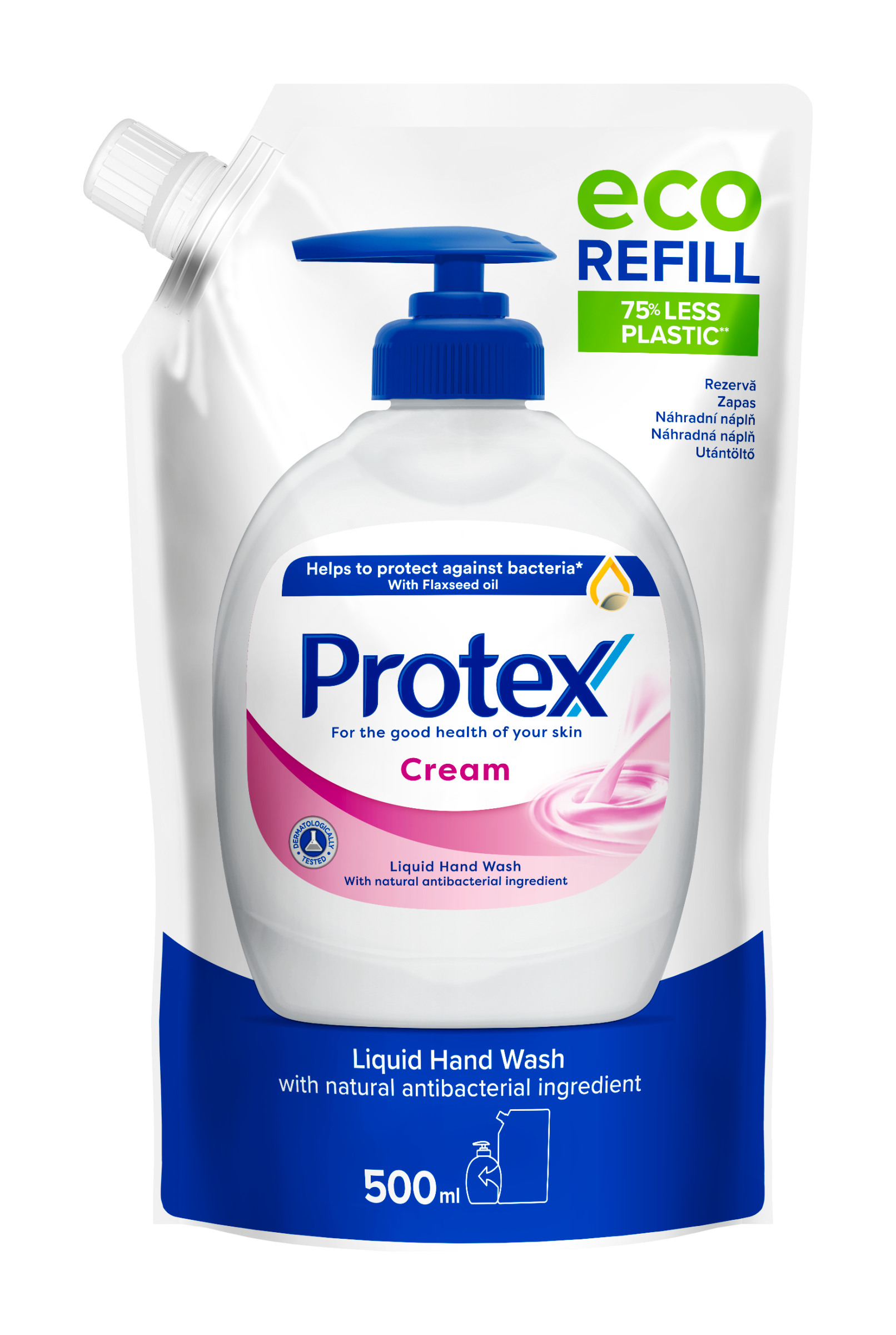 Doplňte své tekuté mýdlo na ruce Protex Cream pomocí tohoto praktického náhradního balení. Toto náhradní balení mýdla na ruce vám pomáhá chránit se před bakteriemi při pravidelným mytím rukou. Složení obsahuje lněný olej a je obohaceno o zvlhčující látky, které pomáhají udržovat přirozenou hydrataci vaší pokožky. Mýdlo na ruce bylo dermatologicky testováno a má jemnou a krémovou vůni, obohacenou o květinové tóny, bílý pižmo a pudrové dřevo. A s o 75 % méně plastu** je toto náhradní balení mýdla na ruce také šetrnější k životnímu prostředí. **Toto náhradní balení používá o 75 % méně plastu na ml produktu než 300ml balení tekutého mýdla na ruce Protex s pumpičkou.