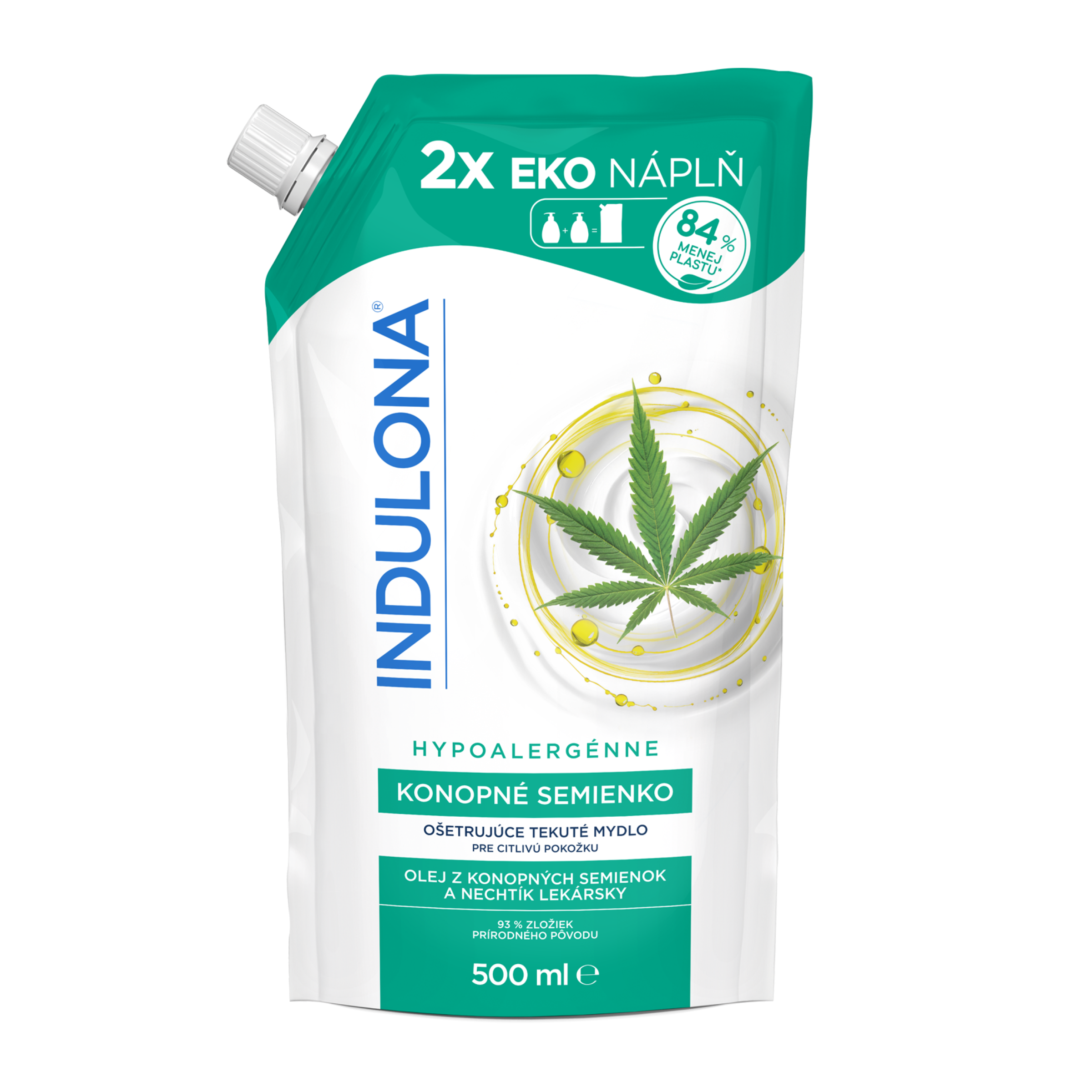 Ekonomické balení Šetříme vaši peněženku Tento obal obsahuje o 84 % méně plastu na mililitr oproti 250ml lahvi tekutého mýdla Indulona s pumpičkou.