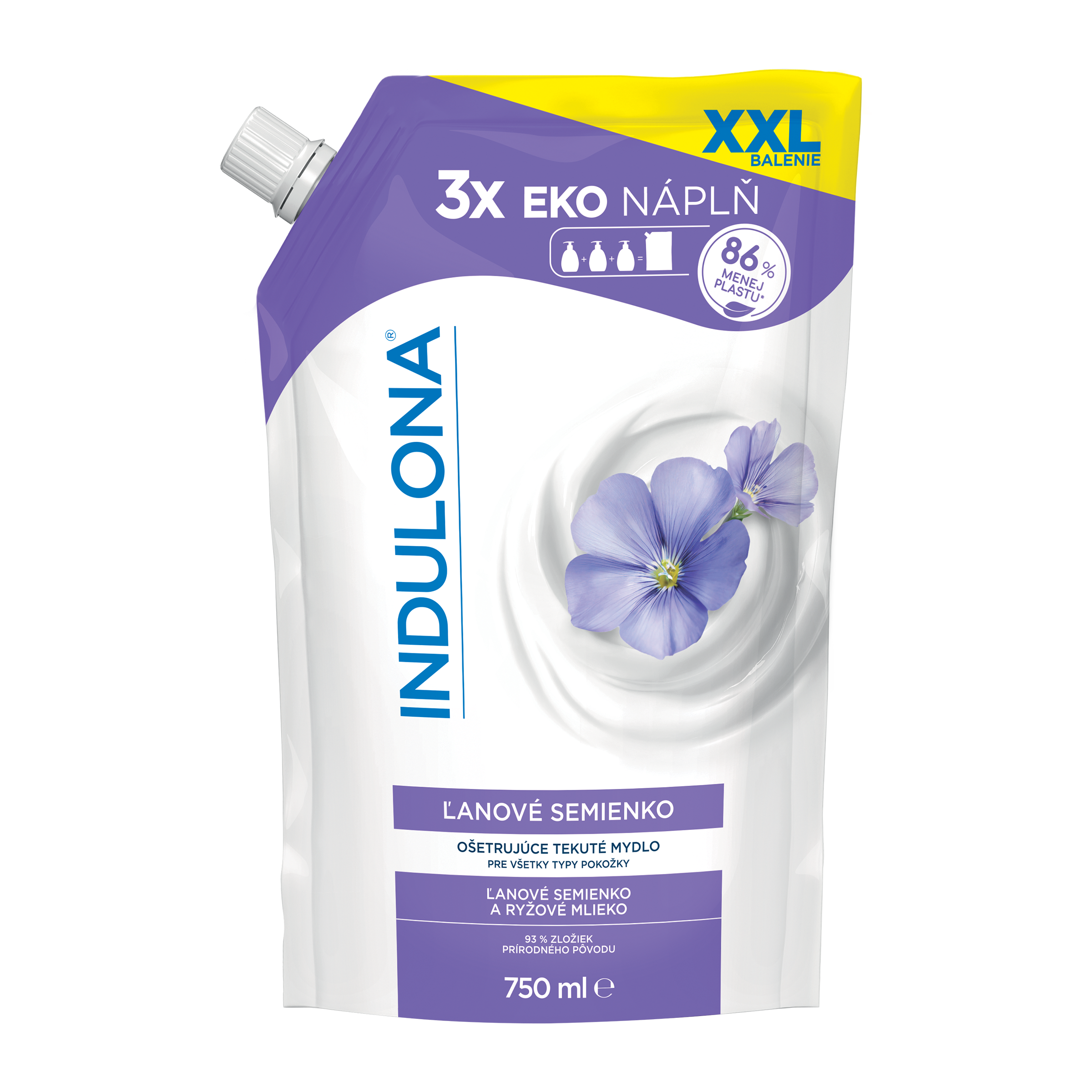 Ekonomické balení Šetříme vaši peněženku Tento obal obsahuje o 86 % méně plastu na mililitr oproti 250ml lahvi tekutého mýdla Indulona s pumpičkou.