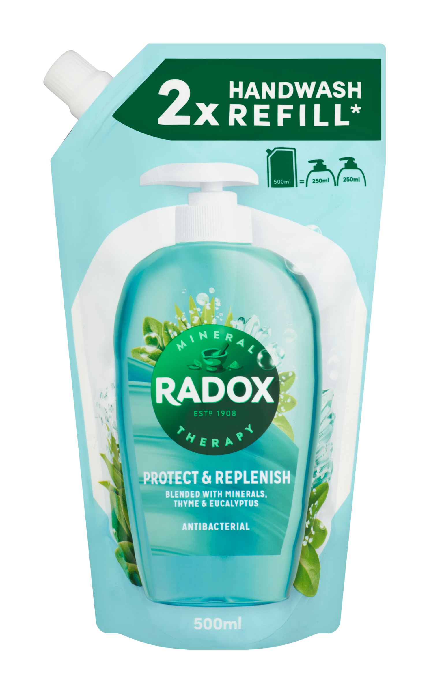 Ochrana a péče pro vaše ruce - tekuté mýdlo Radox Protect+ Replenish s výtažky z tymiánu a olejem s čajovníku, které díky svým přírodním antibakteriálním účinkům pomáhají spolehlivě odstranit nečistotu. Tekuté mýdlo také účinně odstraní nadbytečnou mastnotu bez nežádoucího vysušování. Radox Protect+Replenish 500ml v náhradní náplní je ekologičtější a ekonomičtější volbou pro vaši domácnost.
