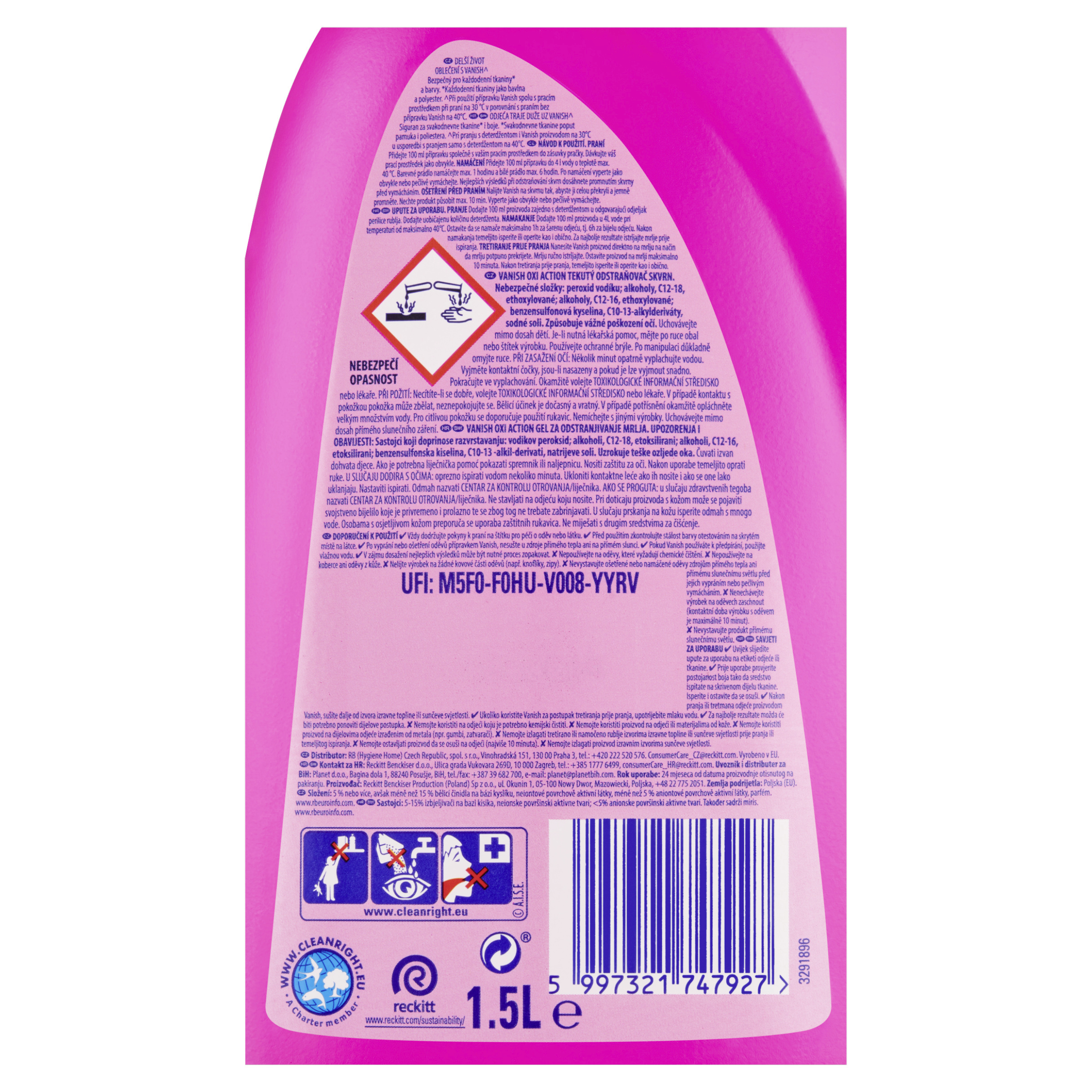 NEBEZPEČÍ VANISH OXI ACTION TEKUTÝ ODSTRAŇOVAČ SKVRN. Nebezpečné složky: peroxid vodíku; alkoholy, C12-18, ethoxylované; alkoholy, C12-16, ethoxylované; benzensulfonová kyselina, C10-13-alkylderiváty, sodné soli. Způsobuje vážné poškození očí. Uchovávejte mimo dosah dětí. Je-li nutná lékařská pomoc, mějte po ruce obal nebo štítek výrobku. Používejte ochranné brýle. Po manipulaci důkladně omyjte ruce. PŘI ZASAŽENÍ OČÍ: Několik minut opatrně vyplachujte vodou. Vyjměte kontaktní čočky, jsou-li nasazeny a pokud je lze vyjmout snadno. Pokračujte ve vyplachování. Okamžitě volejte TOXIKOLOGICKÉ INFORMAČNÍ STŘEDISKO nebo lékaře. PŘI POŽITÍ: Necítíte-li se dobře, volejte TOXIKOLOGICKÉ INFORMAČNÍ STŘEDISKO nebo lékaře. V případě kontaktu s pokožkou pokožka může zbělat, neznepokojujte se. Bělicí účinek je dočasný a vratný. V případě potřísnění okamžitě opláchněte velkým množstvím vody. Pro citlivou pokožku se doporučuje použití rukavic. Nemíchejte s jinými výrobky. Uchovávejte mimo dosah přímého slunečního záření.