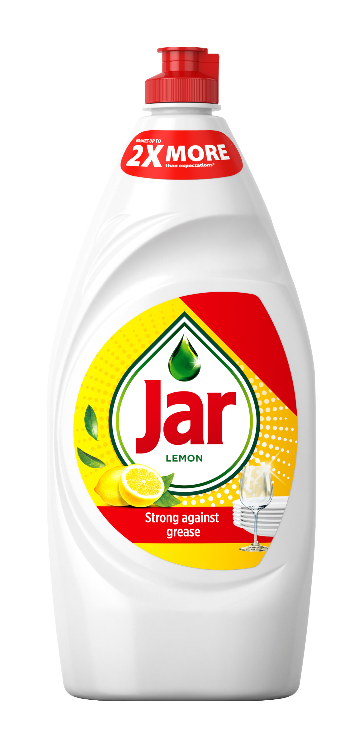 Každá kapka Jaru Lemon má extra dlouho trvající čisticí účinky, které od svého prostředku na mytí nádobí očekáváte. Jeho koncentrované složení si dokáže okamžitě poradit s mastnotou a vaše nádobí bude zářivě čisté. Je účinný u 100 % různých typů mastnoty z jídla. Tento základní tekutý prostředek na mytí nádobí Jar je tak koncentrovaný, že vám ke snadnému umývání nádobí bude stačit jen kapka: žádné namáčení, žádná mastnota, žádný problém.