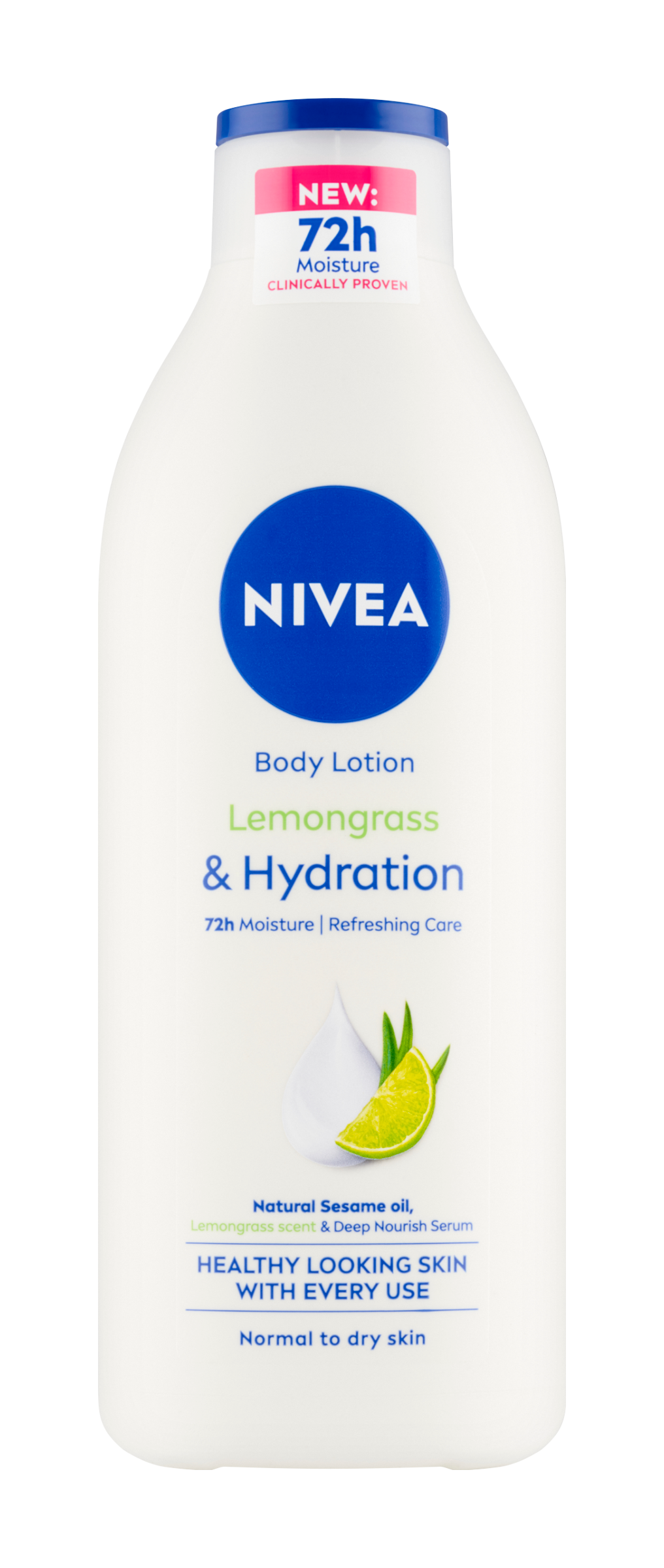 Nivea® Tělové mléko Lemongrass & Hydration hloubkově hydratuje pokožku po 72 hodin. Rychle se vstřebávající a nemastné složení s vůní citronové trávy je obohacené o přírodní sezamový olej a hloubkově vyživující sérum.