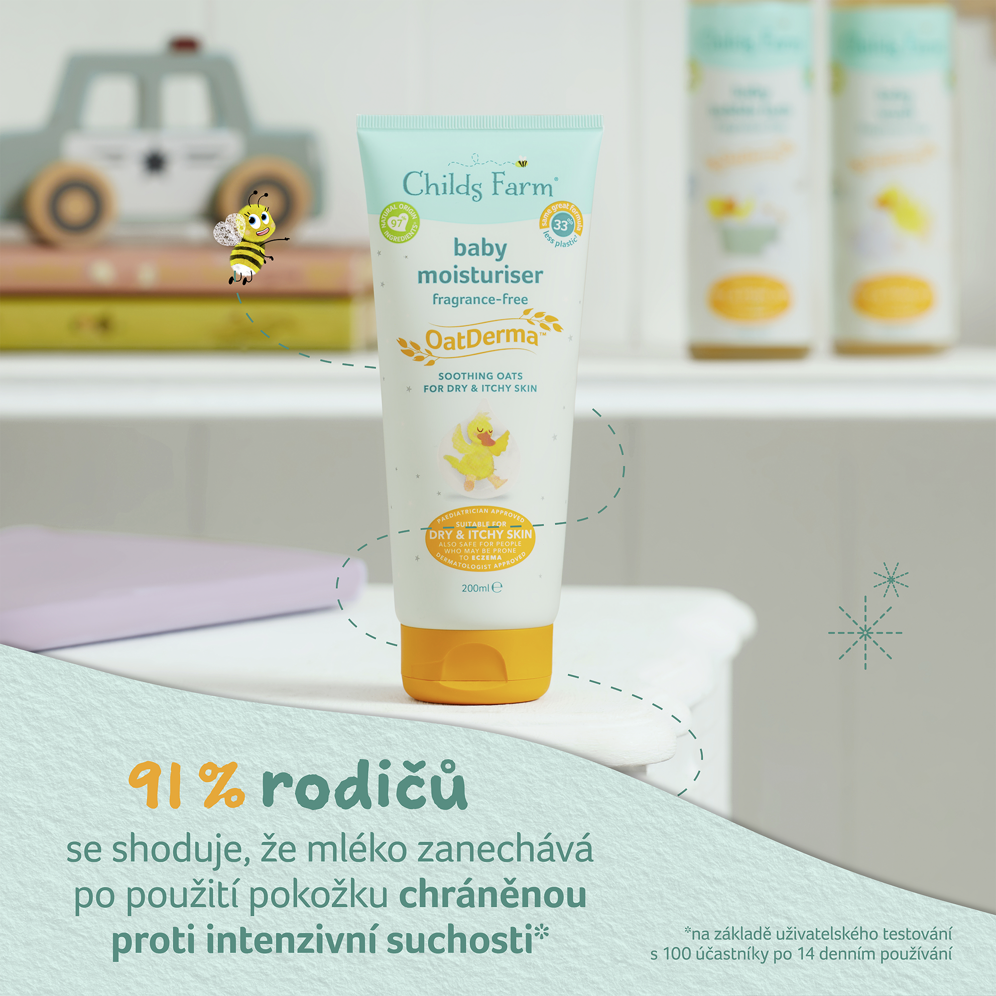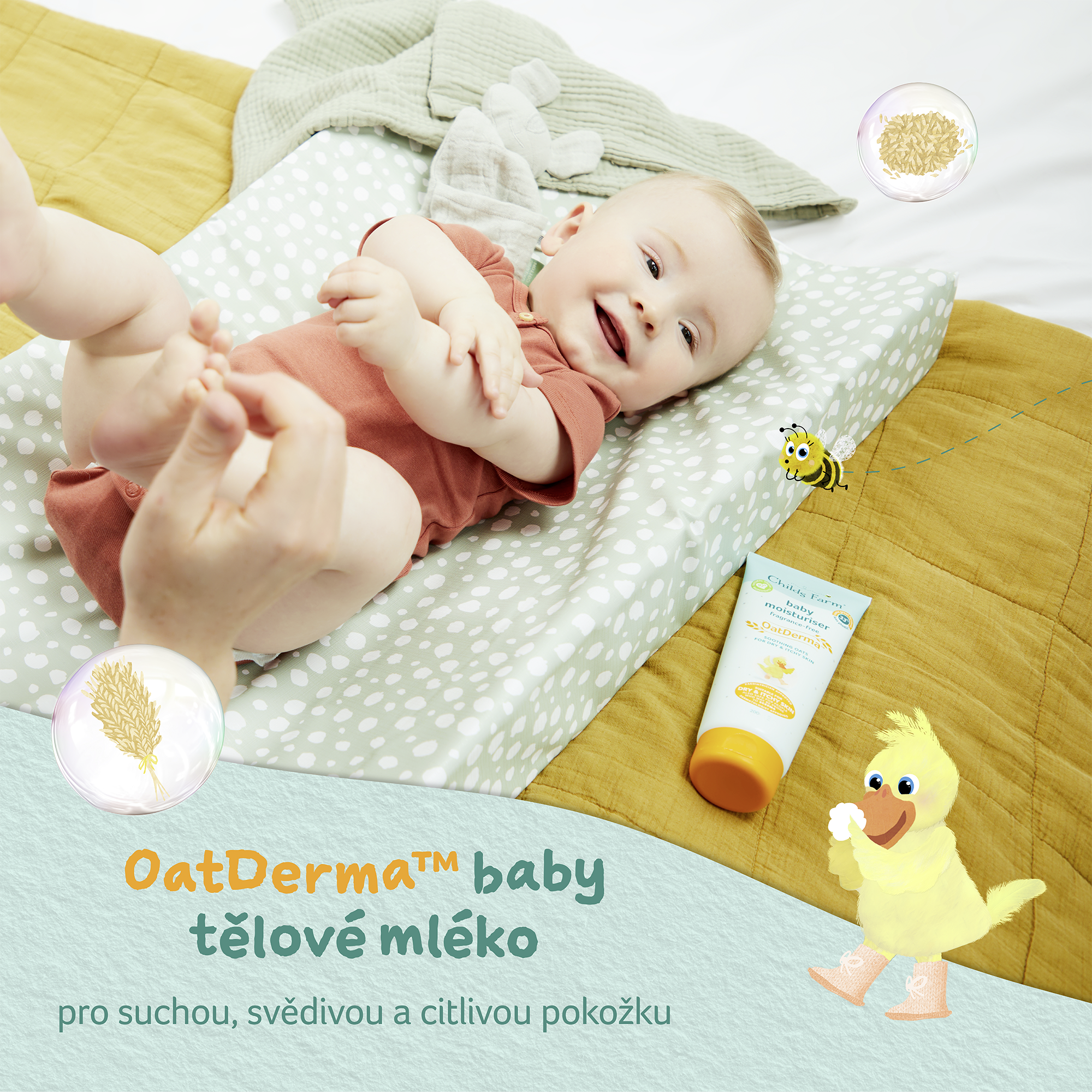 OatDerma™ je řada produktů pro miminka, která byla vytvořena speciálně pro suchou svědivou pokožku a je vhodná i pro pokožku se sklony k ekzému. Produkty obsahují koloidní ovesné vločky bohaté na betaglukany a avenanthramidy, které klinicky prokazatelně zklidňují a jemně vyživují citlivou pokožku a ovesný olej bohatý na ceramidy, které pokožce napomáhají se vstřebáním a udržováním vlhkosti. Produkty jsou bez parfemace, jsou schválené dermatology i pediatry a nesou označení vegan a cruelty free. Tělové mléko pokožce miminka poskytuje maximální hydrataci a zároveň ji zklidňuje a pomáhá chránit kožní bariéru. Pokud vaše miminko trápí suchá a svědivá pokožka, doporučujeme i mycí emulzi nebo bublinkovou koupel z řady OatDerma™.
