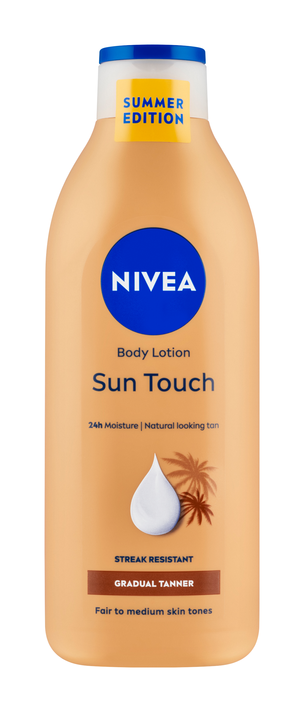Nivea® Tónovací tělové mléko Sun Touch s výtažky z ginkgo biloby a s olejem z jadérek hroznového vína pokožku hydratuje a propůjčí jí rovnoměrné, přirozeně vypadající opálení.