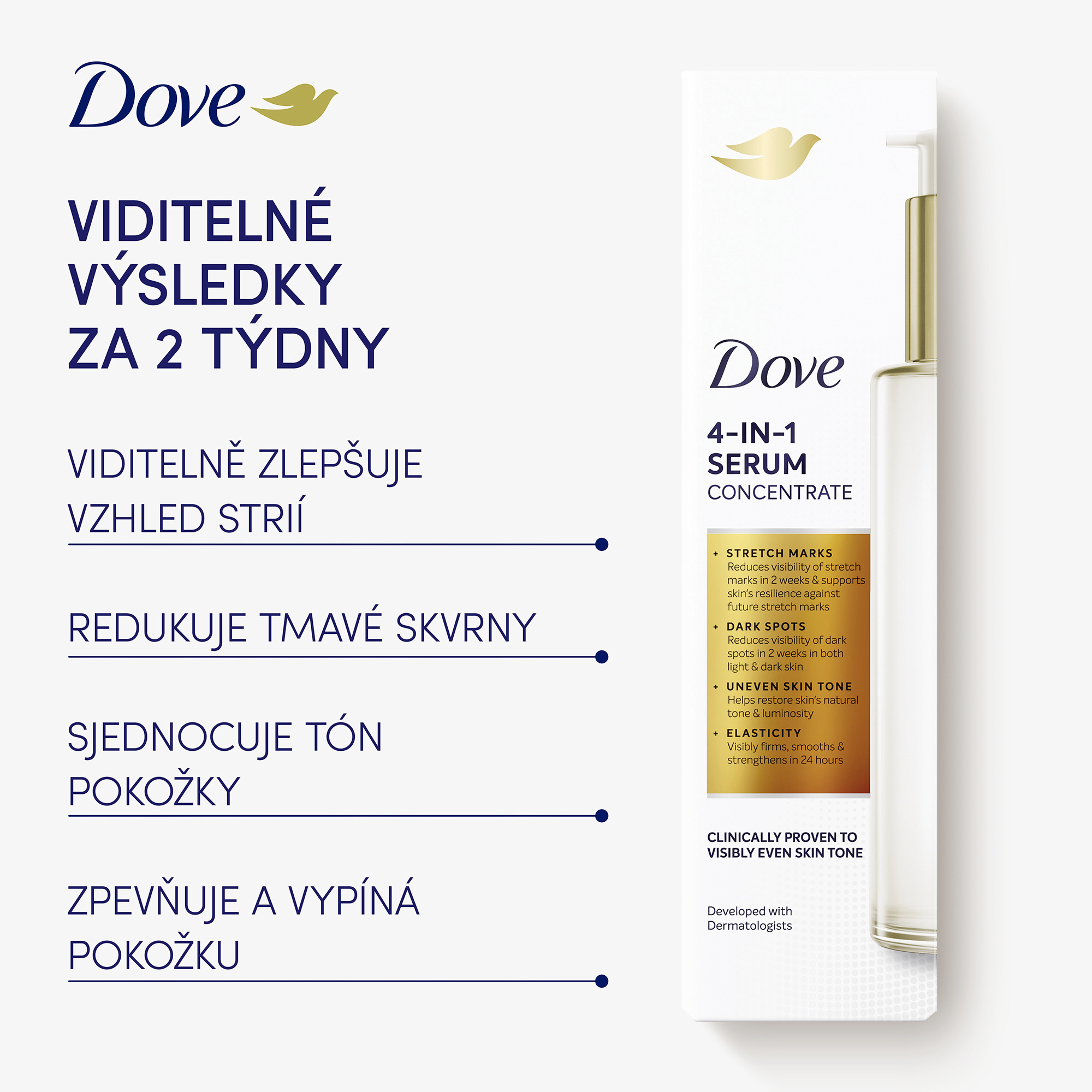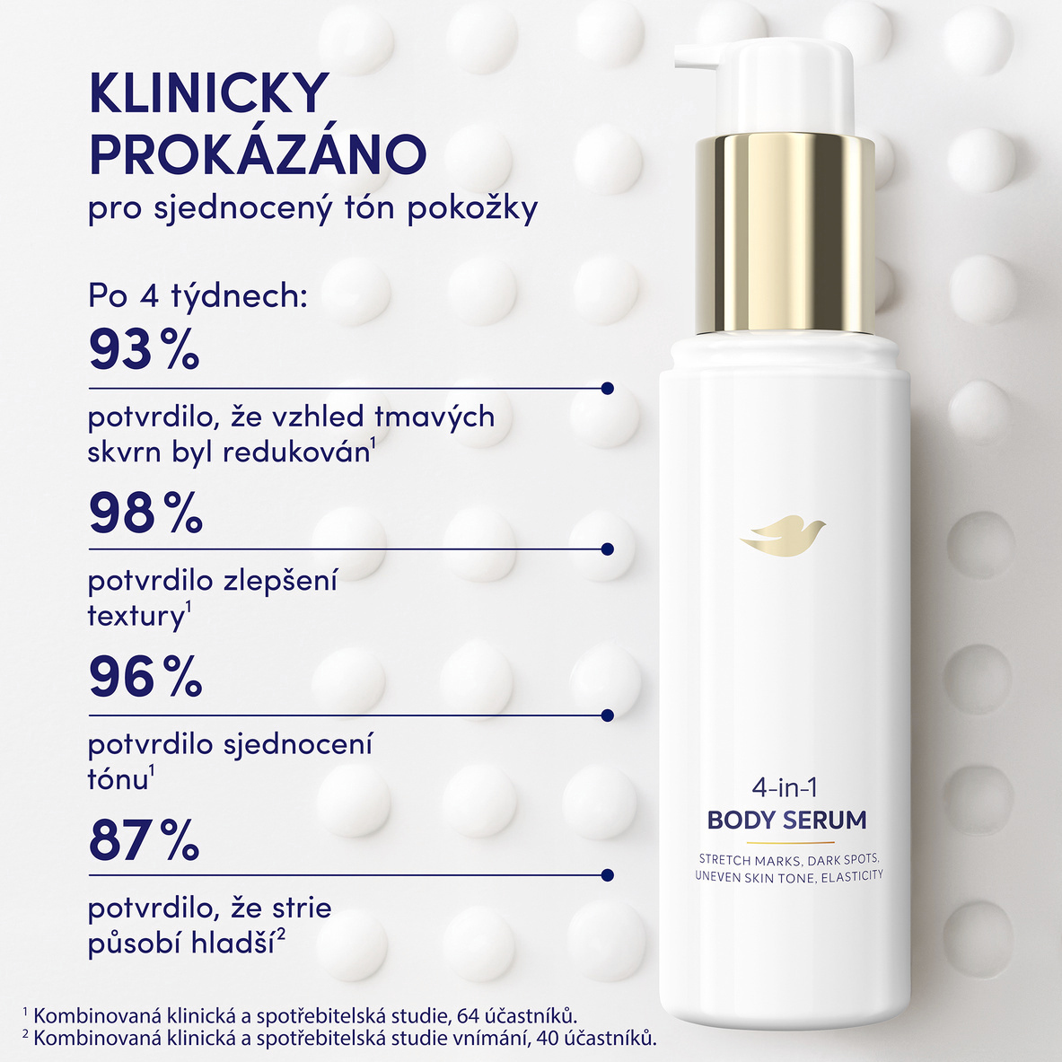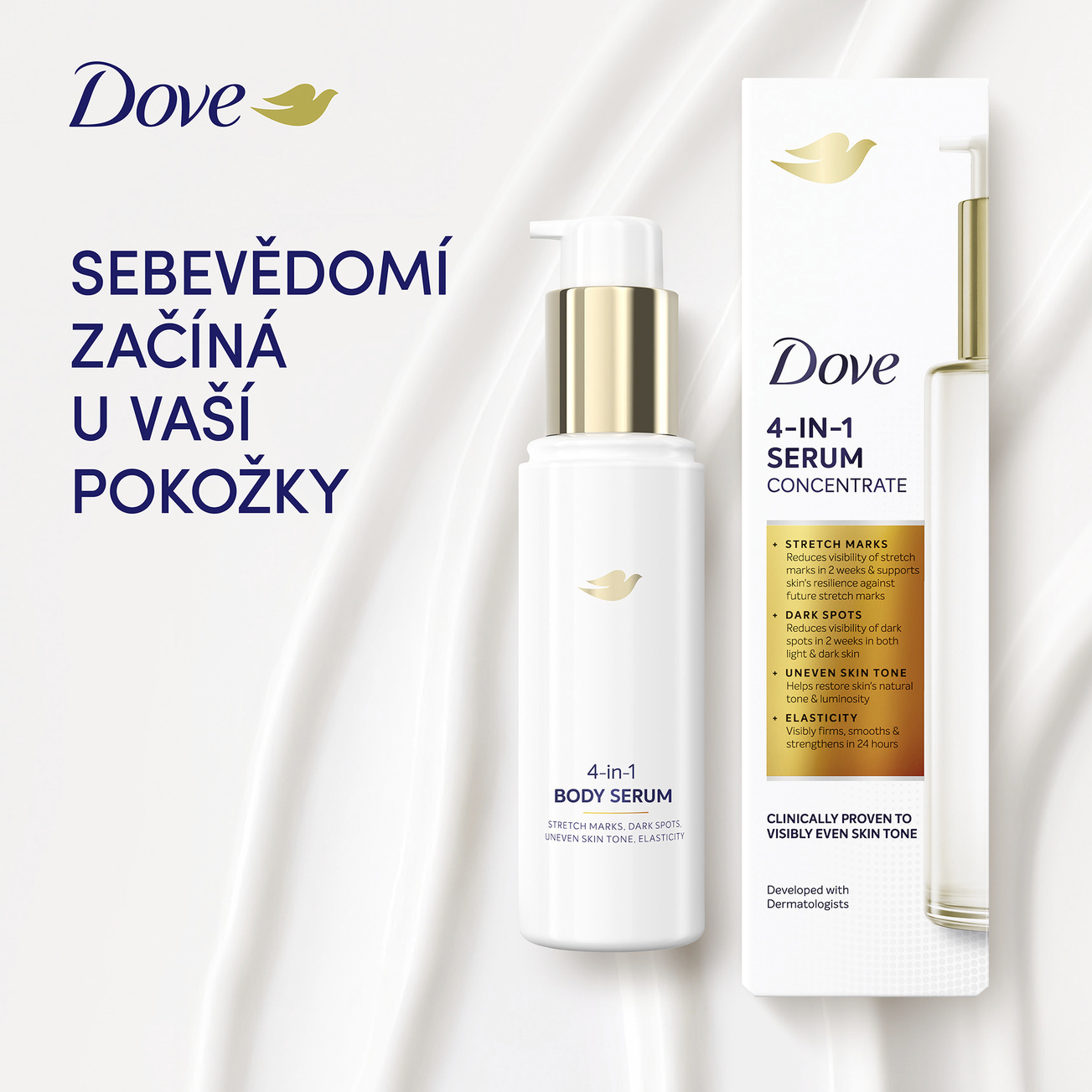 Objevte sílu účinných sér, nyní pro celé vaše tělo - s novým tělovým sérem Dove 4v1. Toto multifunkční sérum bylo klinicky testováno a prokázáno, že pomáhá redukovat strie, tmavé skvrny, zlepšuje pružnost pokožky a sjednocuje její tón. Je ideální pro namáhané oblasti, které potřebují intenzivní péči, obnovu a dlouhotrvající hydrataci. Jeho složení je obohaceno o účinné aktivní látky, které podporují hojení pokožky, posilují její strukturu a zajišťují viditelně zářivější vzhled. Díky 48hodinové hydrataci je pokožka okamžitě jemná, vypnutá a viditelně obnovená. Viditelné výsledky se dostavují už od prvního použití - pokožka je hydratovaná, namáhané oblasti zklidněné a po 4 týdnech jsou strie viditelně bledší, pleť působí pevněji, pružněji a má rovnoměrnější tón. Dove 4v1 tělové sérum - pro tělo, které je sjednocené, pevné, pružné a krásně hydratované.