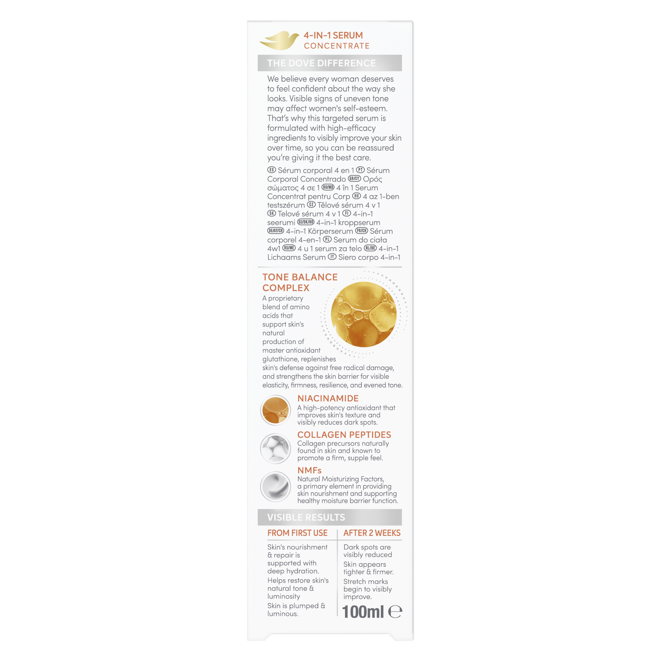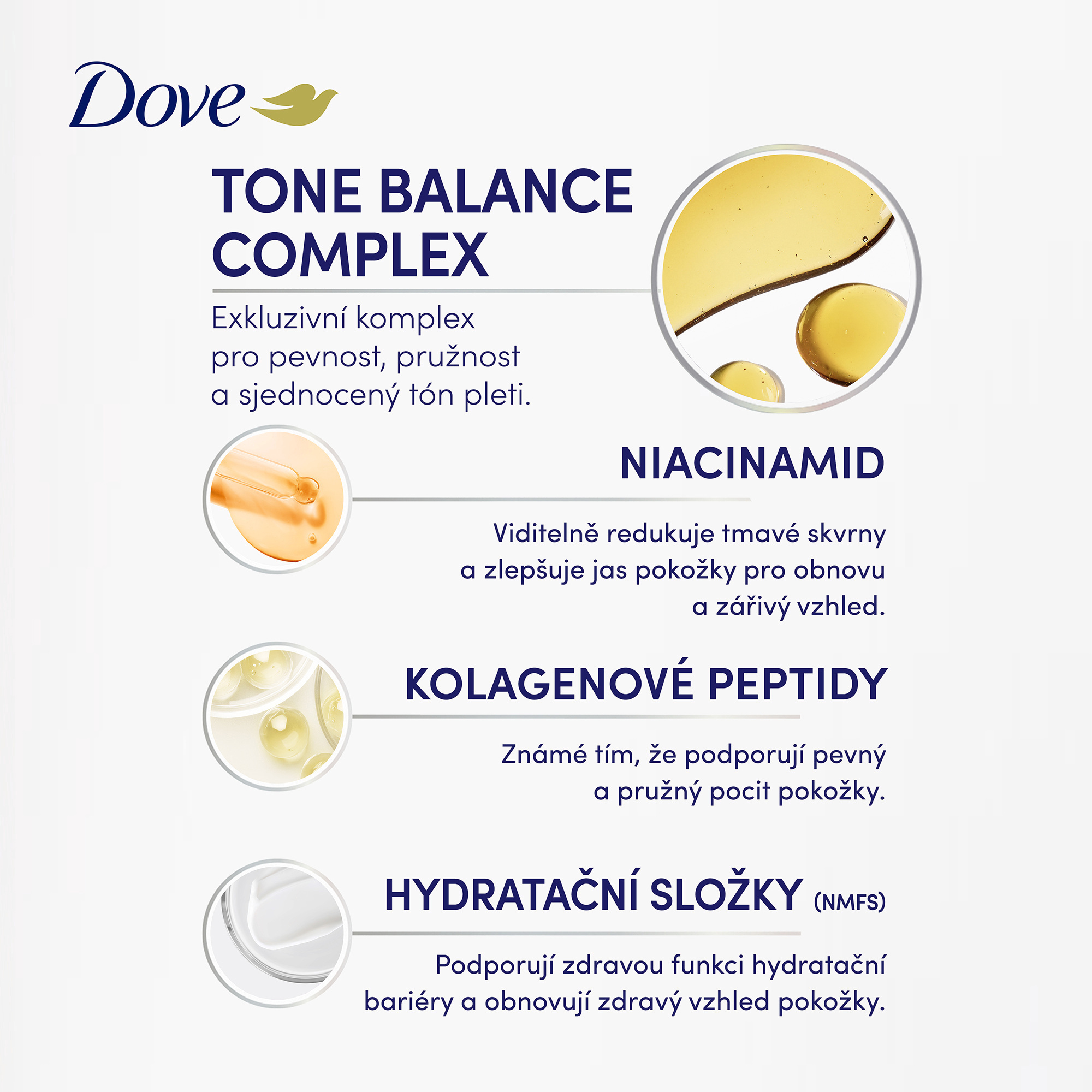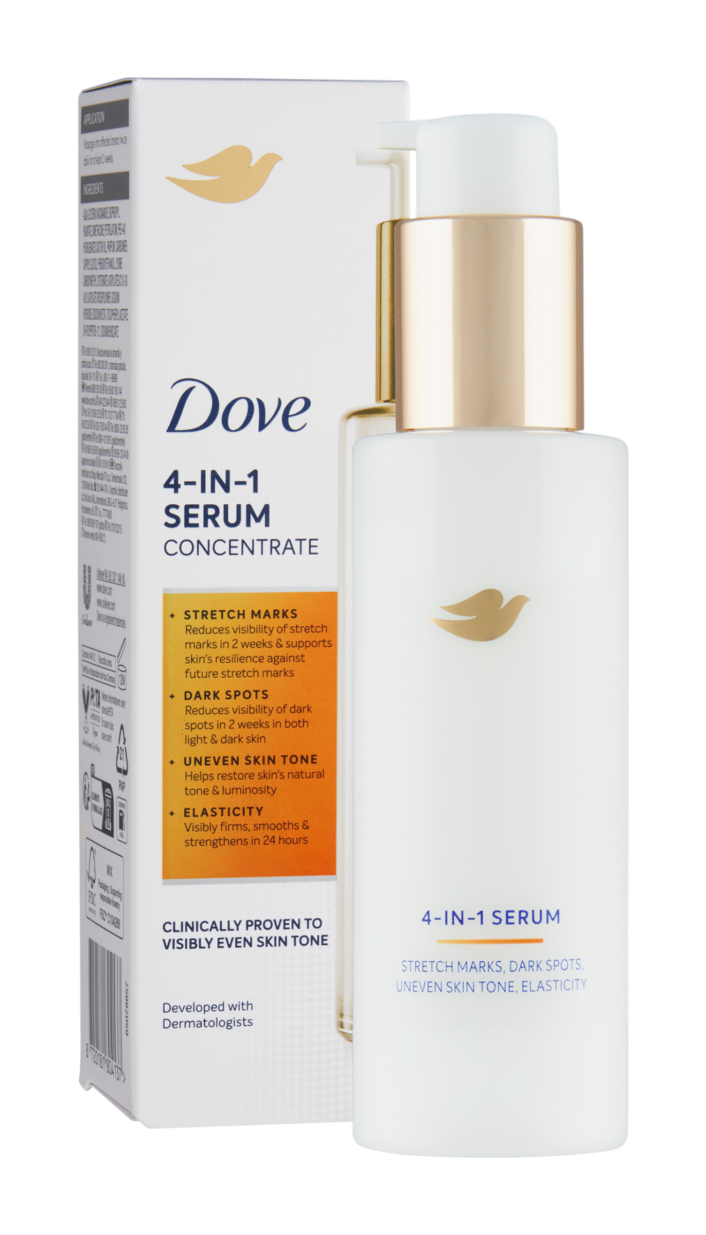 Objevte sílu účinných sér, nyní pro celé vaše tělo - s novým tělovým sérem Dove 4v1. Toto multifunkční sérum bylo klinicky testováno a prokázáno, že pomáhá redukovat strie, tmavé skvrny, zlepšuje pružnost pokožky a sjednocuje její tón. Je ideální pro namáhané oblasti, které potřebují intenzivní péči, obnovu a dlouhotrvající hydrataci. Jeho složení je obohaceno o účinné aktivní látky, které podporují hojení pokožky, posilují její strukturu a zajišťují viditelně zářivější vzhled. Díky 48hodinové hydrataci je pokožka okamžitě jemná, vypnutá a viditelně obnovená. Viditelné výsledky se dostavují už od prvního použití - pokožka je hydratovaná, namáhané oblasti zklidněné a po 4 týdnech jsou strie viditelně bledší, pleť působí pevněji, pružněji a má rovnoměrnější tón. Dove 4v1 tělové sérum - pro tělo, které je sjednocené, pevné, pružné a krásně hydratované.
