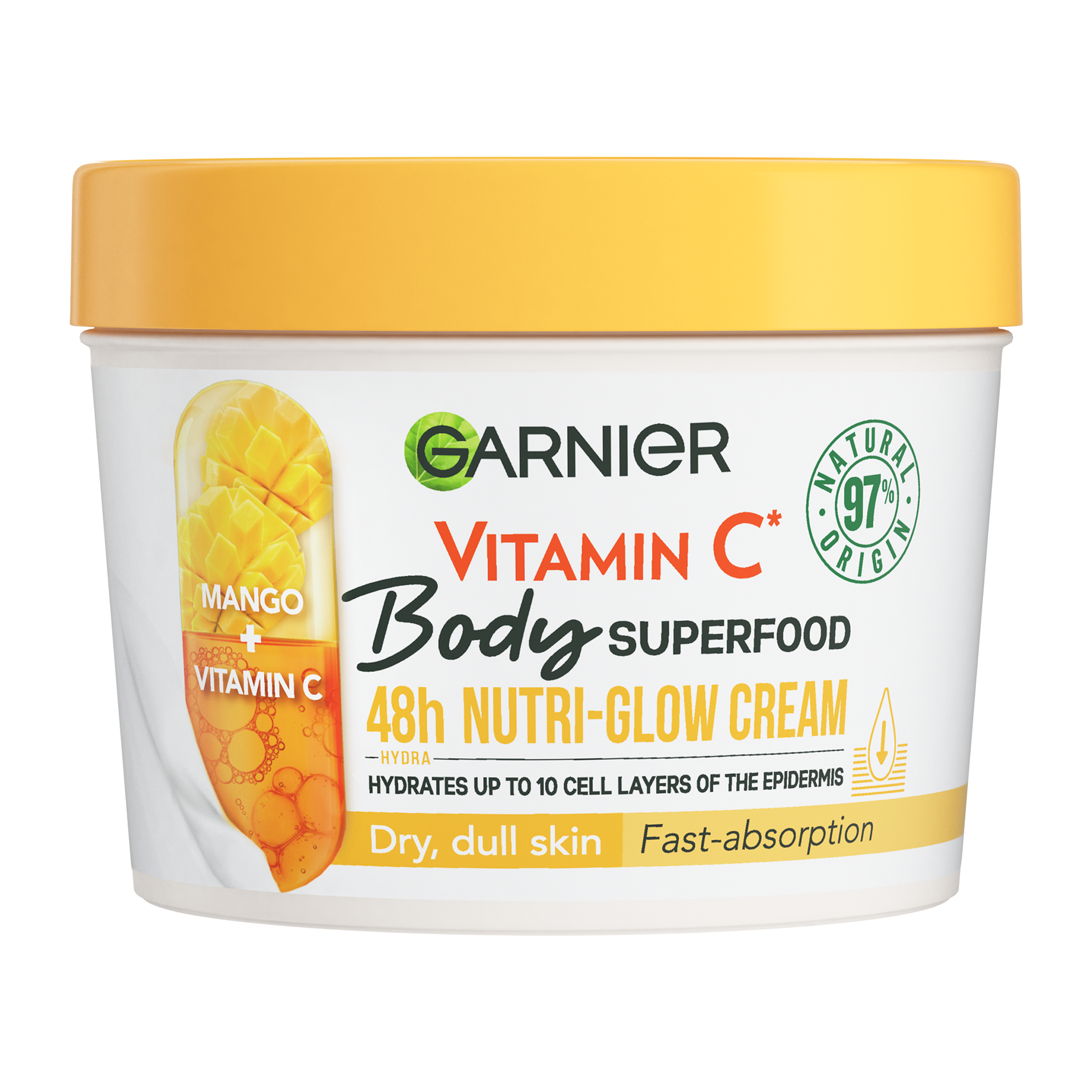 Garnier Body Food Krém na rozjasnění těla Mango + Vitamin C. Mango - extrakt, známý pro svou bohatost na živiny. Vitamin C* - dermální účinná látka známá pro své rozjasňující vlastnosti. *Derivát vitaminu C.