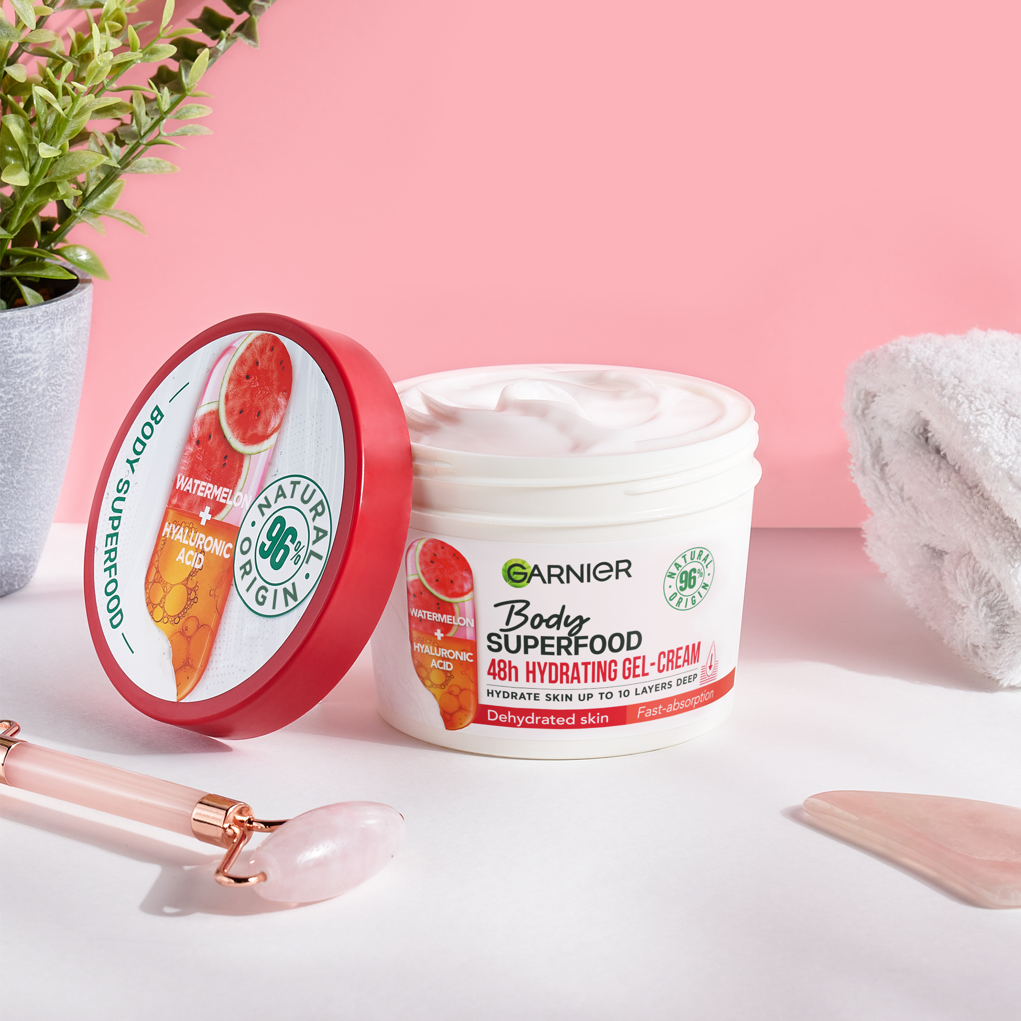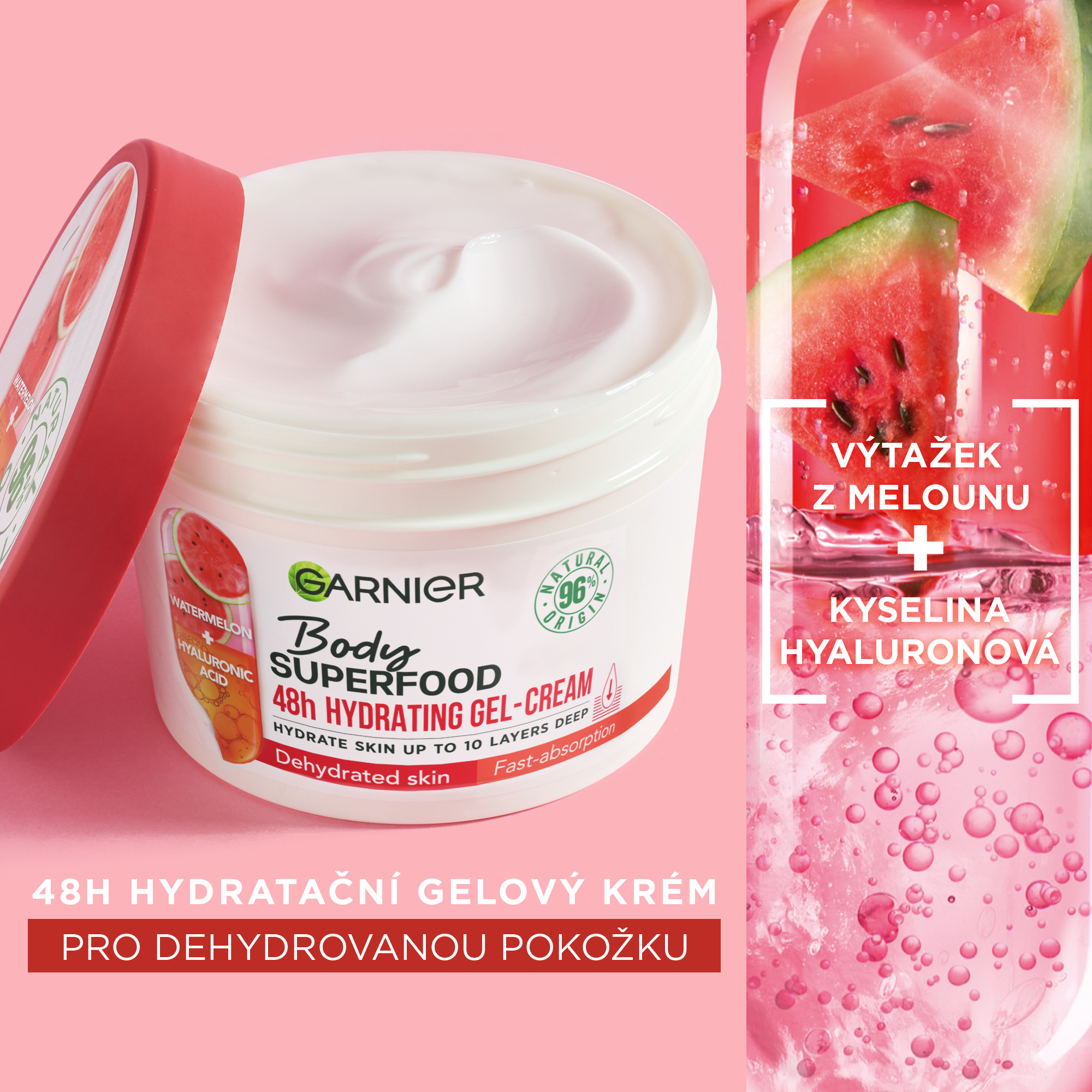 Superfood hydratační gel s melounem má příjemnou, svěží a lehkou texturu. Péče vhodná pro dehydratovanou pokožku poskytuje až 48 hodin hydratace. Vyživuje pokožku až do hloubky 10 vrstev.