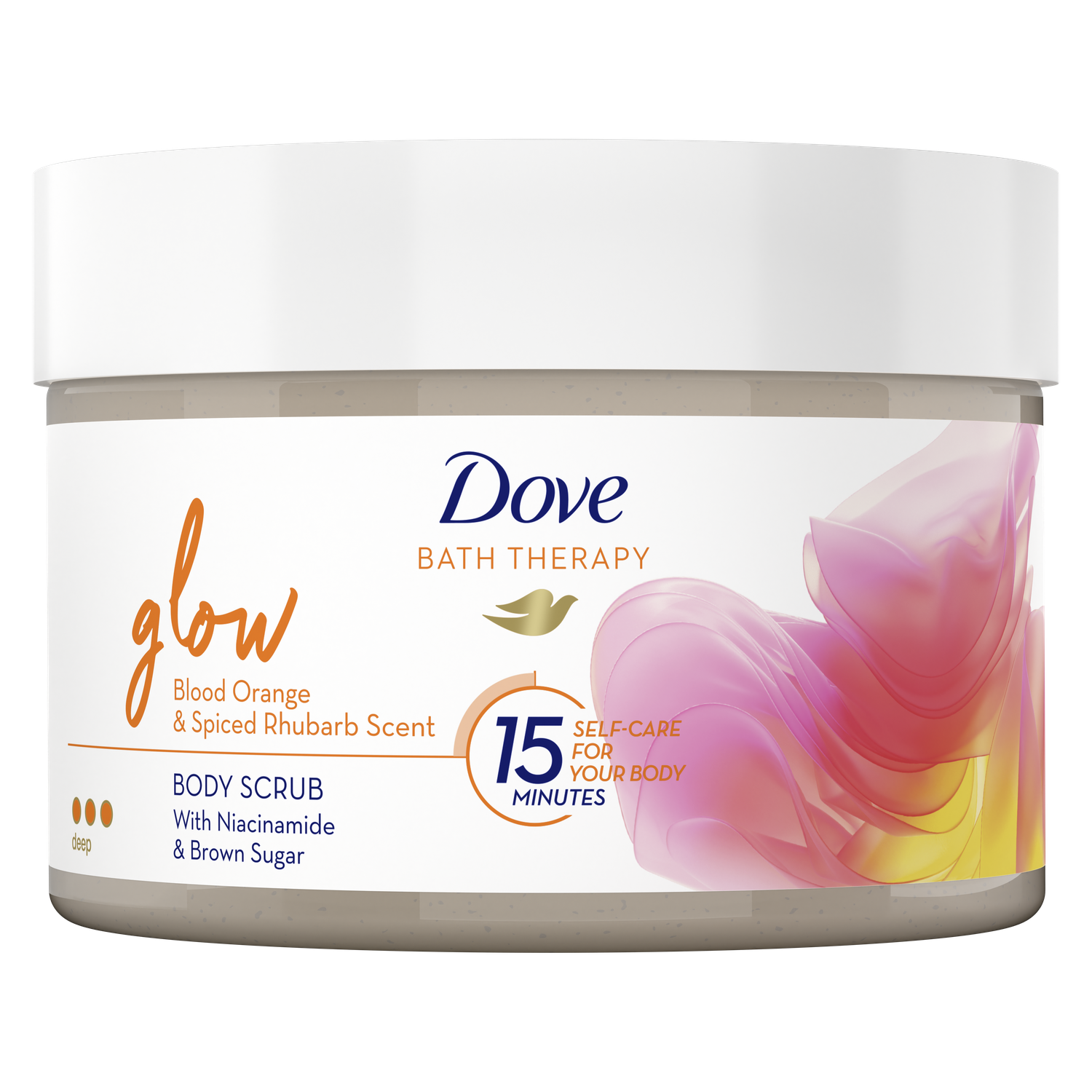 Objevte nový tělový peeling Dove Bath Therapy Glow s vůní červeného pomeranče a rebarbory. Peeling Dove Bath Therapy Glow jemně odstraňuje odumřelé buňky pokožky pomocí částic perlitu a cukrové třtiny. Nejenom že šetrně zjemňuje pokožku, ale zároveň ji čistí a odstraňuje nečistoty. Řada Glow obsahuje také niacinamid, který je znám jako "vitamín krásy". Dopřejte svému tělu 15 minutovou péči s Dove Bath Therapy.