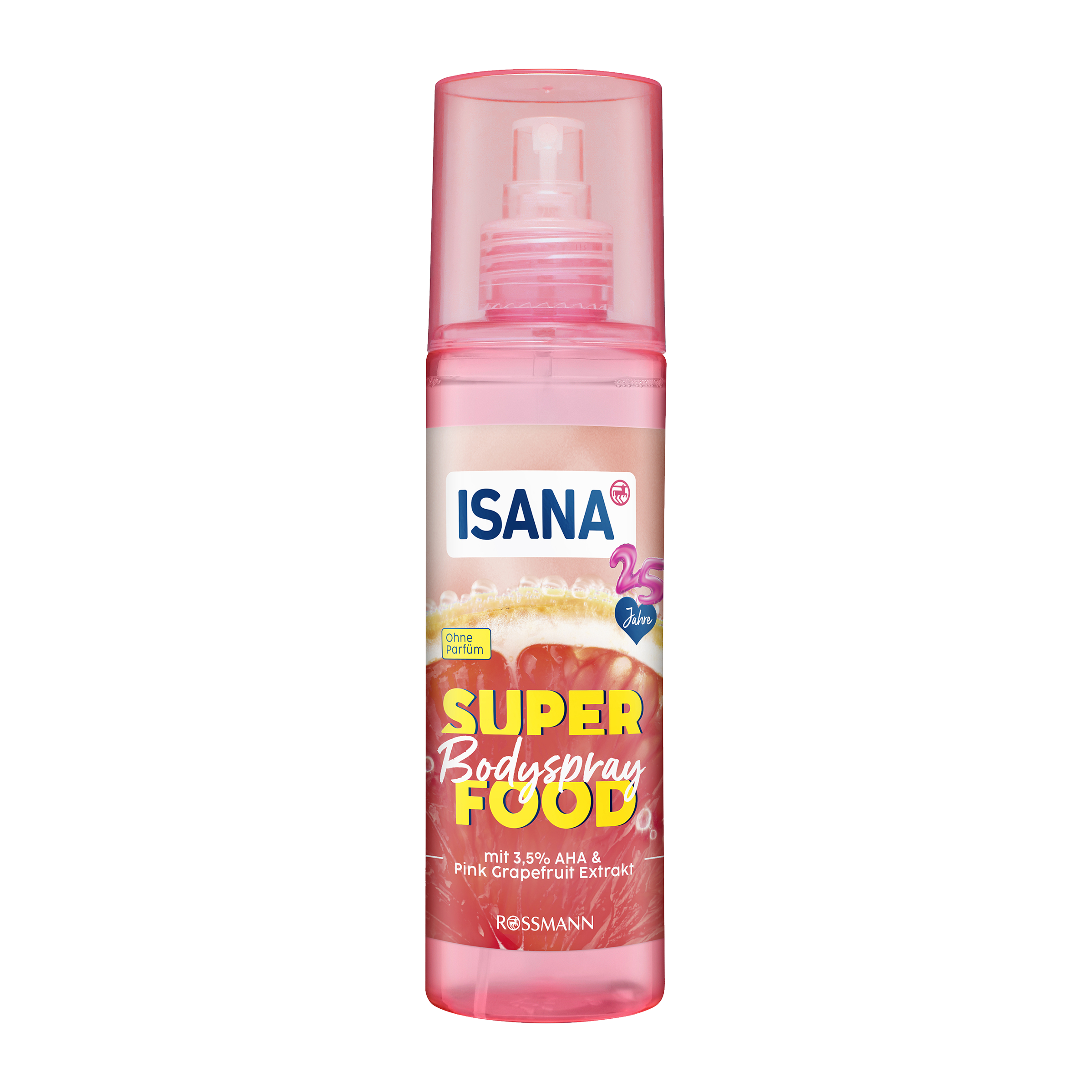 ISANA Bodyspray Superfood s 3,5 % AHA & růžovým grapefruitem šetrně a chemicky exfoliuje pokožku. Pomáhá jemně odstraňovat odumřelé kožní buňky a hydratuje pleť - pro pocit zdokonalené pleti.