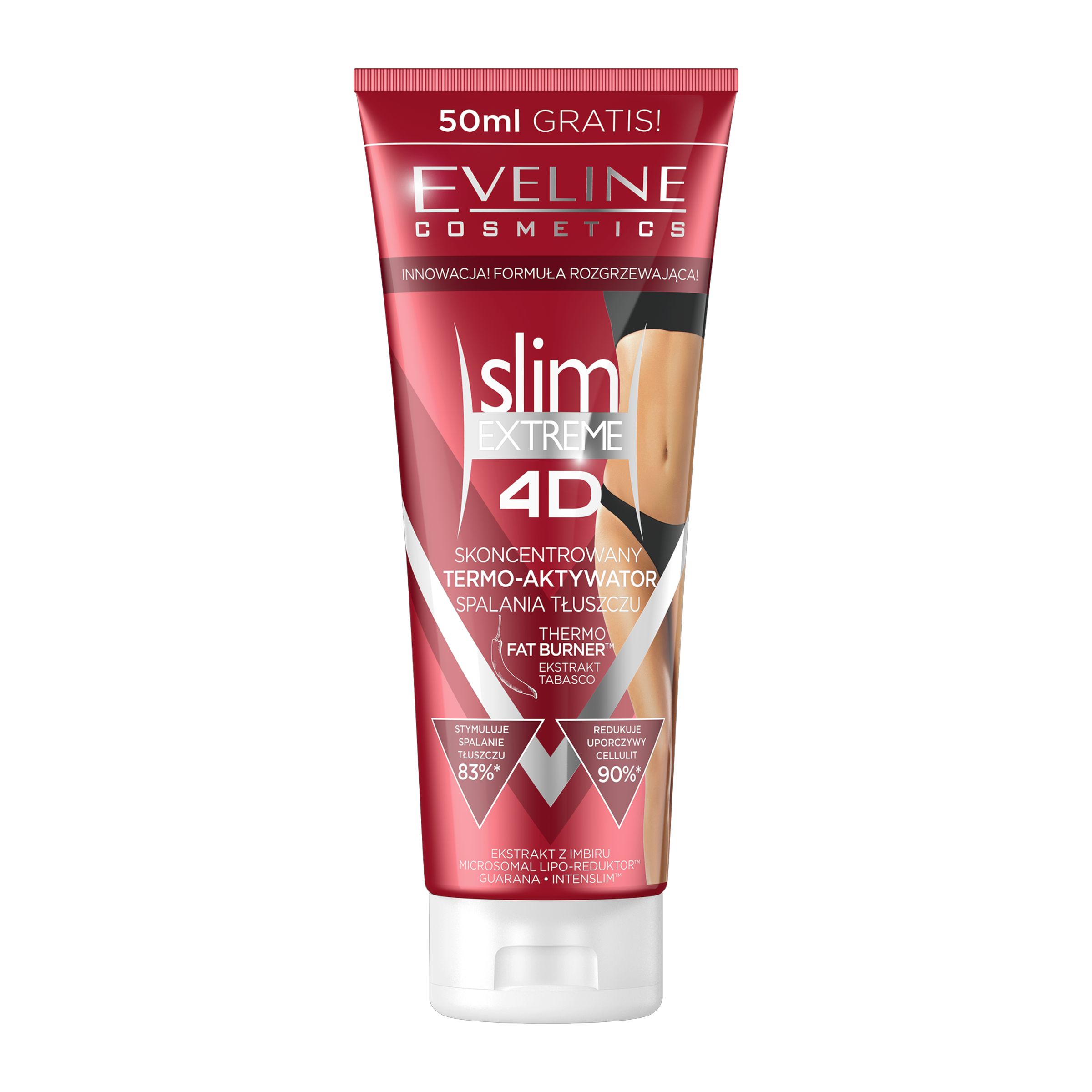 První termoaktivní zeštíhlující sérum proti celulitidě vyvinuté v laboratoři Eveline Cosmetics je unikátní přípravek obsahující účinné látky, které účinně bojují proti úporné celulitidě a nahromaděnému tuku a pomáhají zdokonalovat tvar ženského těla. Technologicky vyspělé složení Thermo Fat Burner jemně zahřívá pokožku, díky čemuž účinné látky během okamžiku pronikají hluboko do epidermis a dosahují maximálních výsledků. Tukové buňky se zmenšují, pokožka se zpevňuje a silueta získává ideální tvar. Thermo Fat Burner aktivně redukuje tukové zásoby, účinně odstraňuje uložené lipidy a zároveň zabraňuje tvorbě nových. Zlepšuje odvodnění a aktivuje procesy vylučování vody a toxinů z těla. Komplex Isocell Slim™, kofein, Centella asiatica intenzivně stimulují spalování tukových buněk, blokují jejich syntézu, díky čemuž aktivně podporují zeštíhlující účinek a účinně snižují příznaky „pomerančové kůže“. Řasy Laminaria, bohaté na minerální soli, hloubkově hydratují, zklidňují a odstraňují přebytečnou vodu z tkání, čímž dále posilují kostru pokožky.