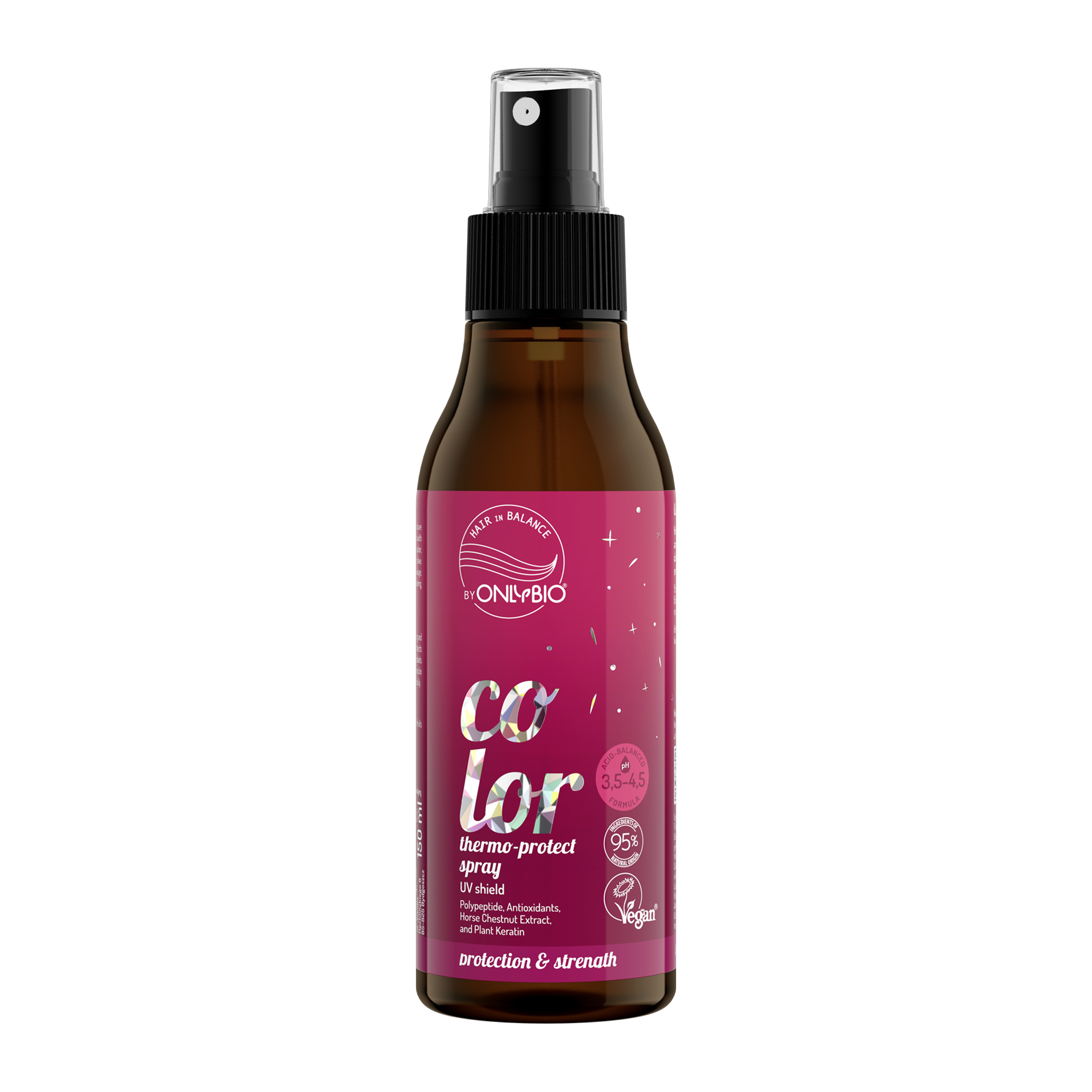 Co chrání? Polypeptid zabraňuje blednutí barvy a dodává lesk. Extrakt z plodů jírovce chrání před vysokými teplotami, antioxidanty před poškozením a rostlinný keratin posiluje a zvyšuje pružnost vlasů.