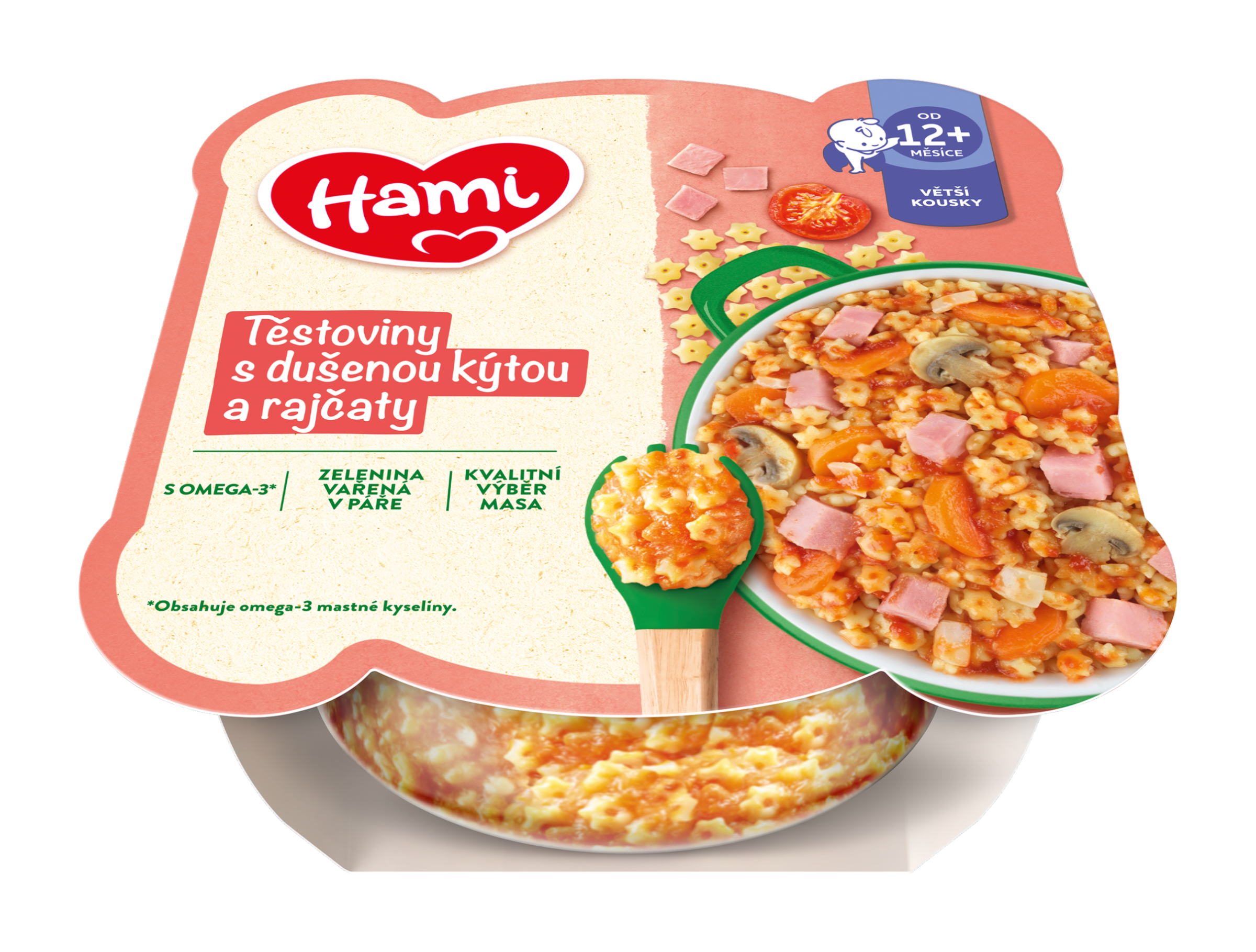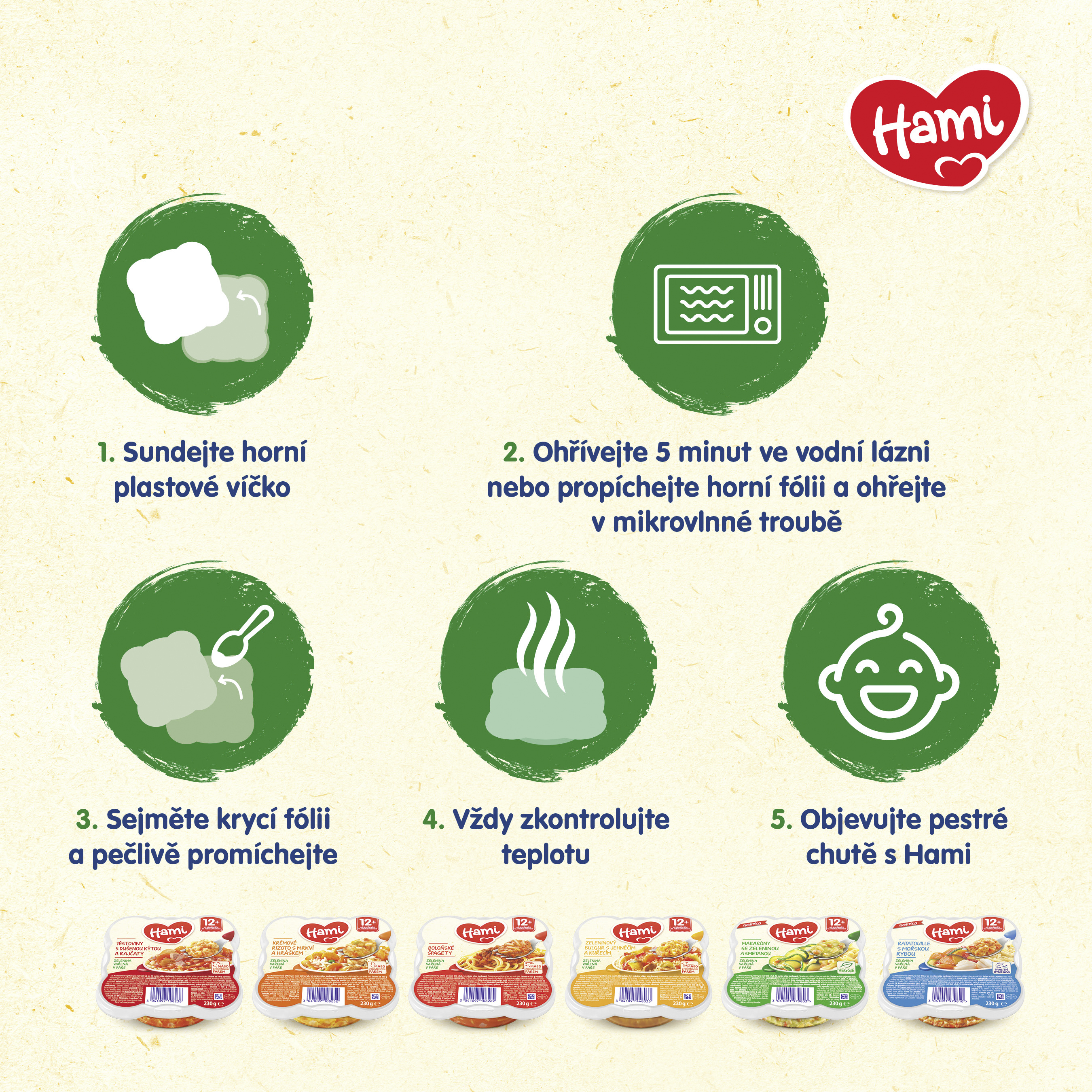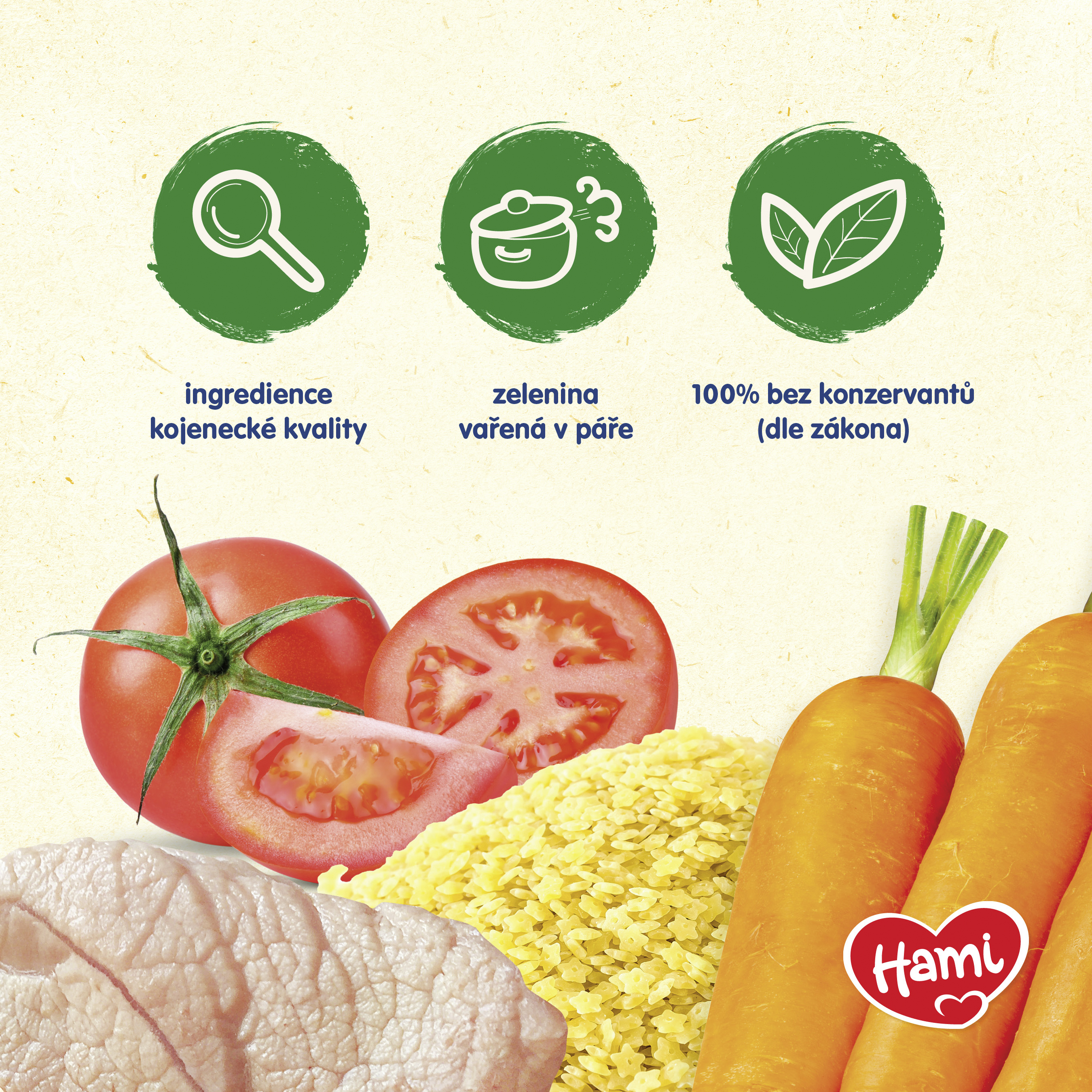 Konzistence Hami příkrmů v talířku podporuje rozvoj kousání prvními zoubky. Hami příkrm obsahuje zeleninu připravovanou na páře, čímž neztratí důležité vitamíny a zachová si vynikající chuť. Vysoká kvalita ingrediencí je v Hami příkrmech na prvním místě. Šťavnaté masíčko pochází z pečlivě kontrolovaných surovin. Proč si děti zamilují příkrm Hami v talířku? S Hami může mít každé dítko svůj mini talířek s chutným obědem či večeří a cítit se jako 'dospělák'. Navíc děťátko rozvíjí motoriku, což ocení maminky a tatínkové. Děti si Hami příkrm zamilují pro lahodnou chuť a maminky pro praktičnost produktu.
