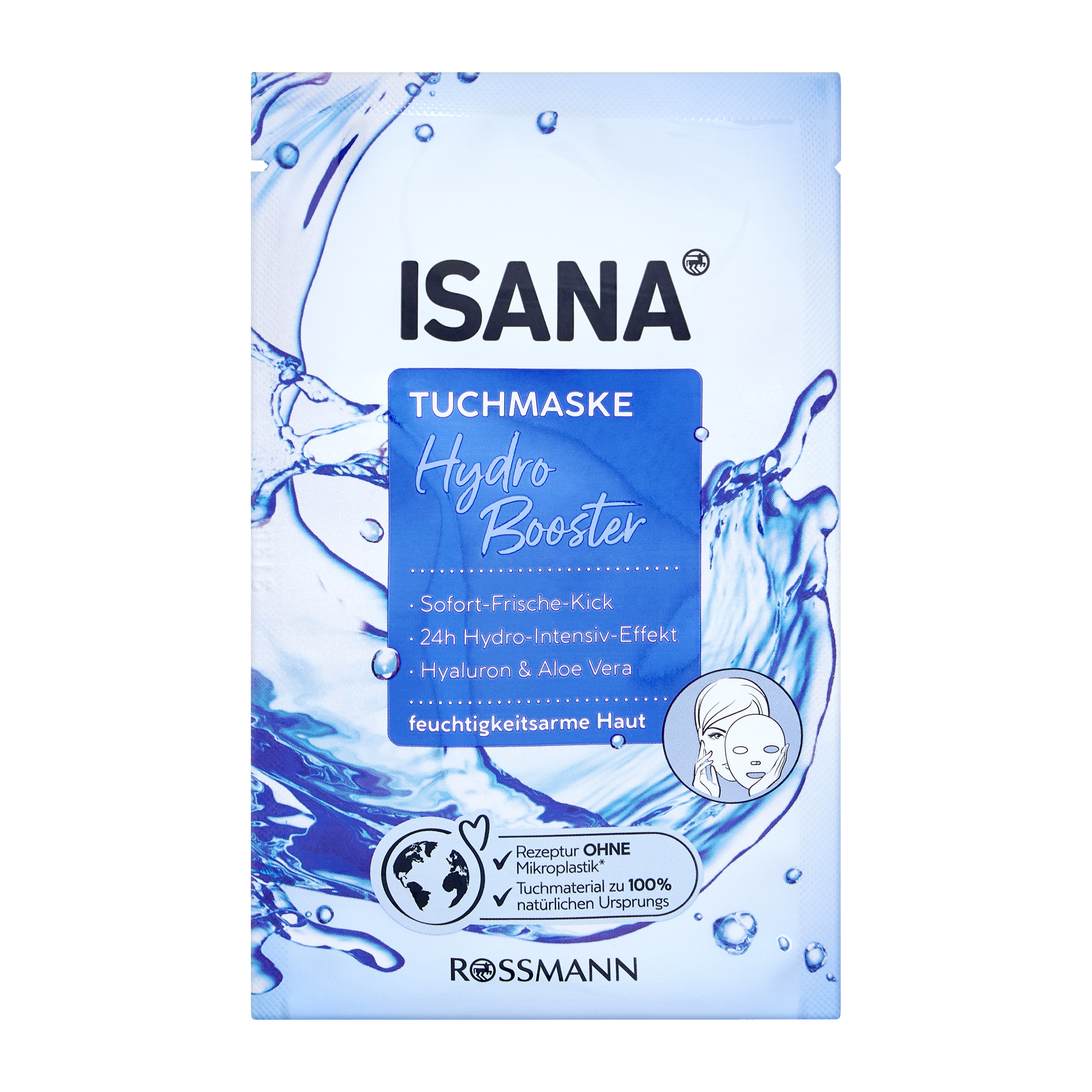 Textilní maska ISANA Hydro Booster s kyselinou hyaluronovou nabízí okamžitý a 24hodinový hydratační účinek, který při pravidelném používání redukuje suché vrásky. Pocity napětí jsou sníženy. Kombinace kyseliny hyaluronové, aloe vera, makadamiového oleje a cupuacu másla podporuje rovnováhu lipidů a vlhkosti. Vaše pleť vypadá zářivě svěží a je hedvábně jemná.