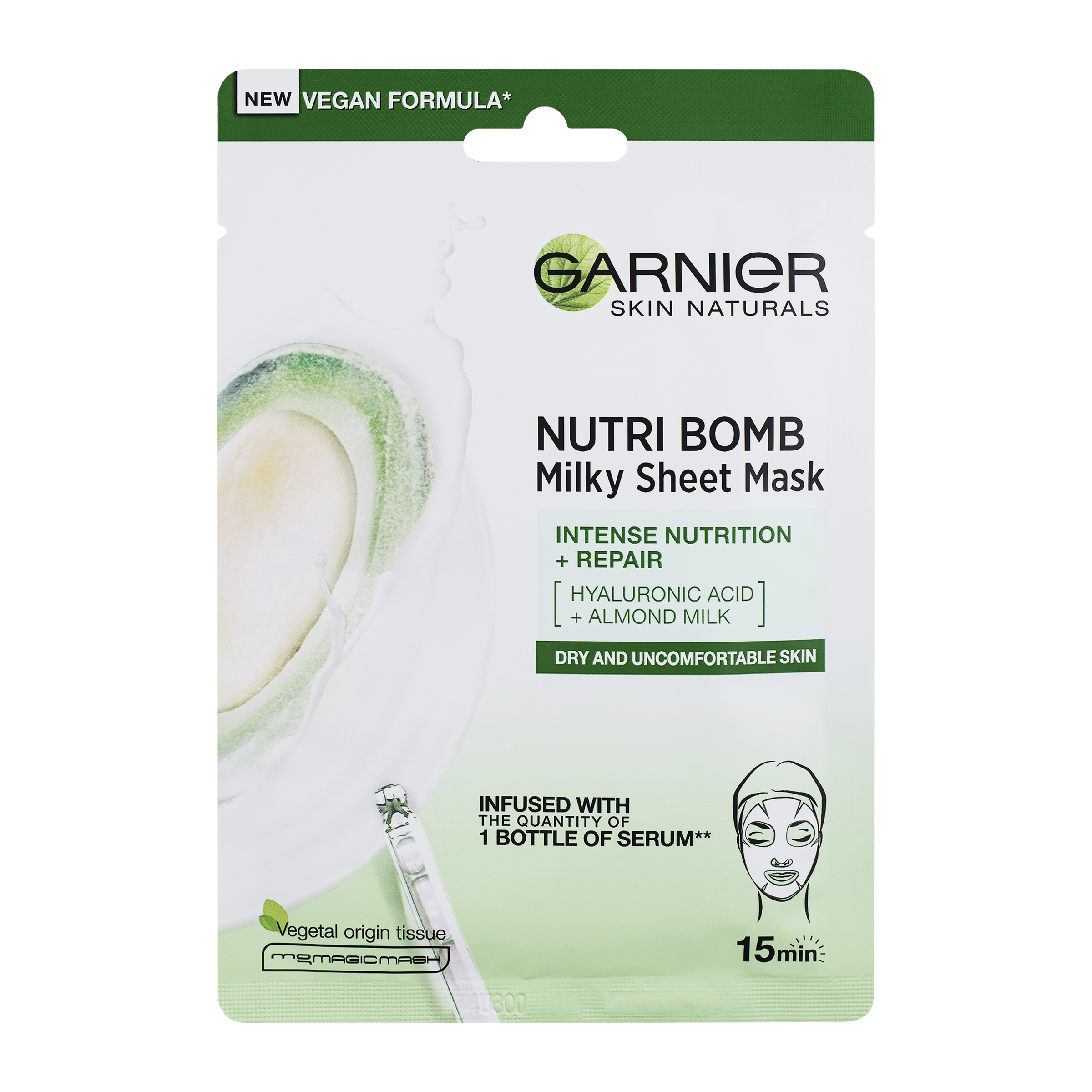 První textilní maska od Garnier s mléčným sérem, která vaši plet intenzivně vyživí a pomůže napravit suchost pleti již za 15 minut! Obsahuje sérum s mandlovým mlékem bio a kyselinu hyaluronovou. PROKÁZANÁ ÚČINNOST: Po 15 min.: Suchá pleť je vyživená a suchá místa jsou redukována. Po 1 týdnu: Suchá místa jsou redukována a pleť je pevnější.
