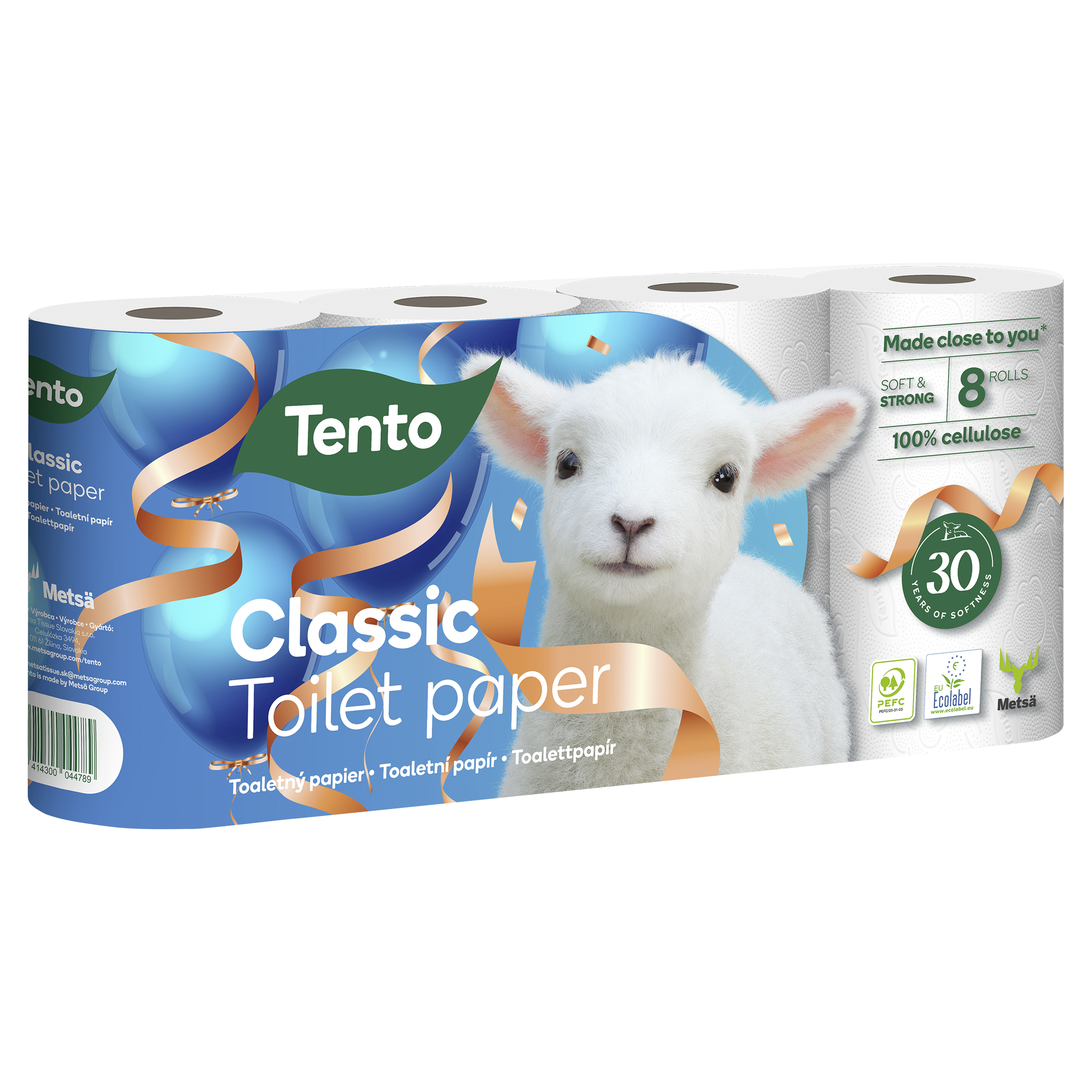 Tento Classic představuje vysoce kvalitní toaletní papír, jemný a zároveň pevný. Je tu pro všechny, kteří preferují čistě bílý papír bez jakékoli parfemace. Toaletní papír, výrobek osobní hygieny, 100 % tissue papír. Tento je značka vysoké kvality pro všechny, kteří chtějí to nejlepší pro sebe a pro své blízké. Produkty Tento jsou šetrné k životnímu prostředí - vyrábějí se lokálně, aby se minimalizovaly emise uhlíku při dopravě. Zodpovědně přistupujeme i k lesům jako zdroji dřeva a za každý zpracovaný strom proto zasadíme 4 nové stromy. Všechny výrobky Tento mají certifikaci PEFC, u více než 88 % dřeva známe jeho přesný původ.