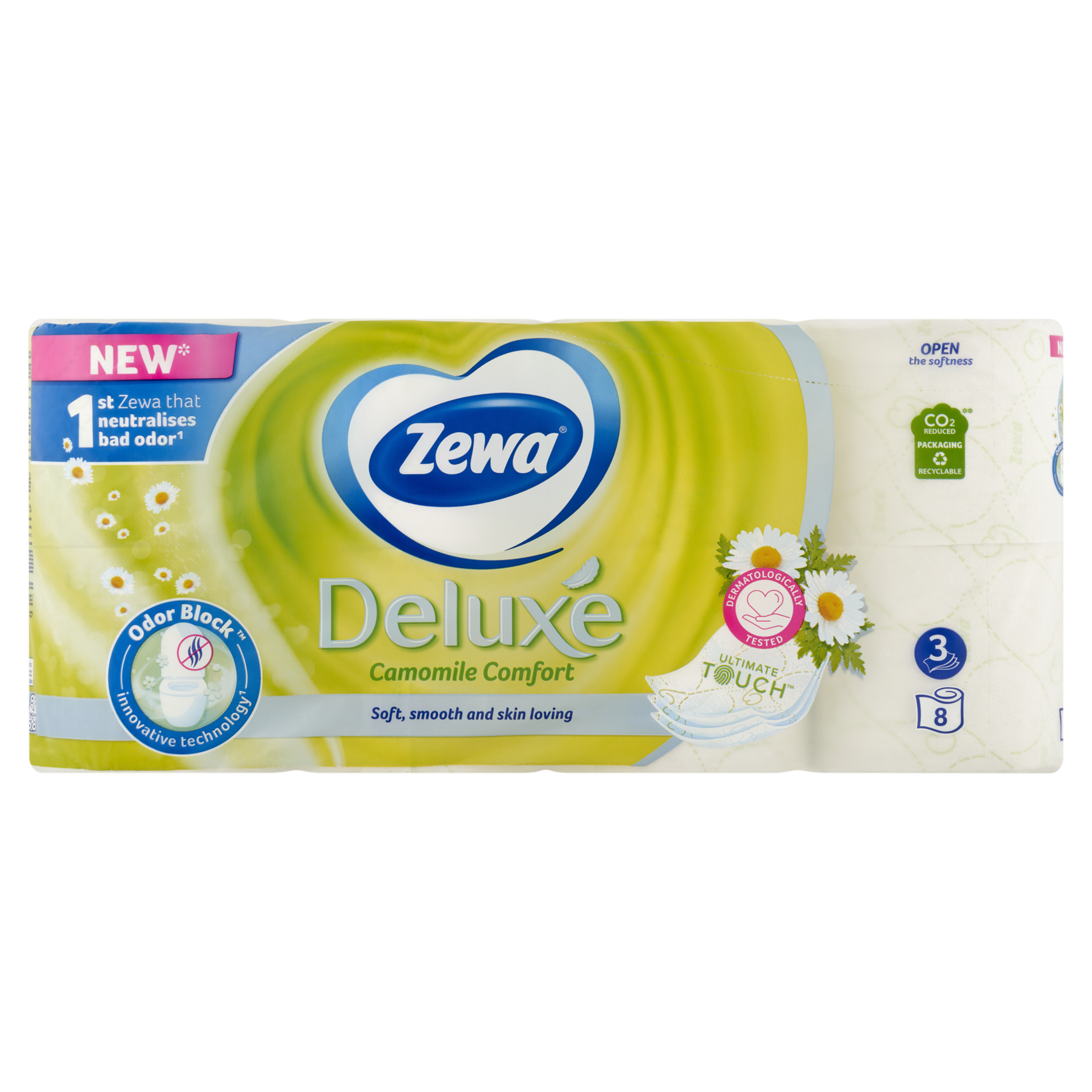 Zewa Deluxe Camomile Comfort toaletní papír nabízí dokonalou rovnováhu mezi funkčností - díky třem vrstvám a komfortem jemných a pevných polštářků. Je tak ideální pro rodiny, které chtějí pečovat o svou pokožku, aniž by slevily z kvality. Navíc s technologií OdorBlock™ působí heřmánková vůně jako neutralizátor zápachu, který eliminuje nepříjemné pachy ve vaší koupelně. Jemný dotek toaletního papíru Zewa Deluxe Camomile Comfort vám dodá pocit čistoty a pohodlí, ale nabízí i mnohem více než jen to. Rozpustná a recyklovatelná rulička AquaTube® může být bez obav spláchnuta přímo do toalety. Navíc je balení toaletního papíru recyklovatelné! Toaletní papír Zewa Deluxe Camomile Comfort je vytvořen z přírodních vláken, díky kterým je hedvábně jemný a je tak ideální pro jemnou pokožku, které nabízí maximální pohodlí. Věříme, že hedvábně jemné polštářky, které si však zachovali svou pevnost, uspokojí potřeby vás i vaší rodiny. Papír je navíc dermatologicky testován, aby se minimalizovaly nežádoucí kožní reakce. Vaši koupelnu naplní uklidňující vůně heřmánku, která vám dodá klid a pohodu. Ale to není všechno, součástí toaletního papíru Zewa je nyní nová inovativní technologie OdorBlock™, kdy příjemná heřmánková vůně ve skutečnosti slouží jako neutralizátor zápachu a účinně neutralizuje nepříjemné pachy z koupelny. Na rozdíl od jiných vonných produktů, které nepříjemné pachy pouze maskují. Co více byste si mohli přát?