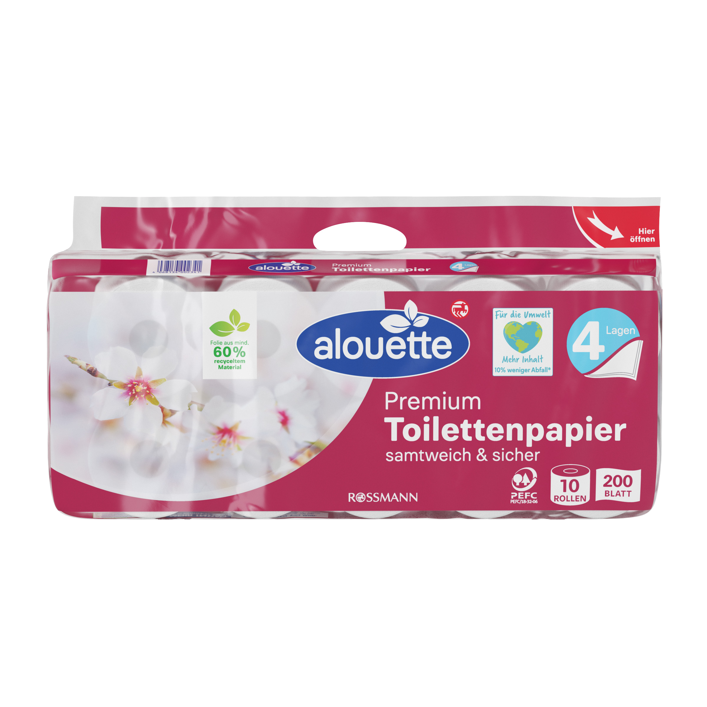 Čtyřvrstvý toaletní papír alouette je díky své textuře měkký a odolný vůči roztržení. Vrstvy drží skvěle pohromadě, a tak je postaráno o nejvyšší bezpečnost a příjemný pocit.