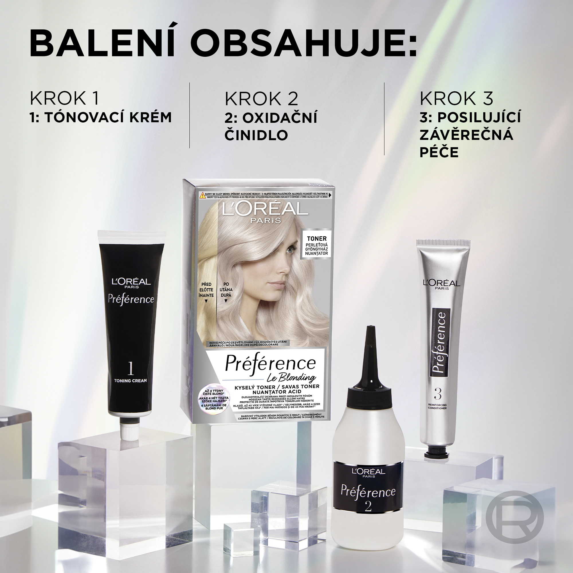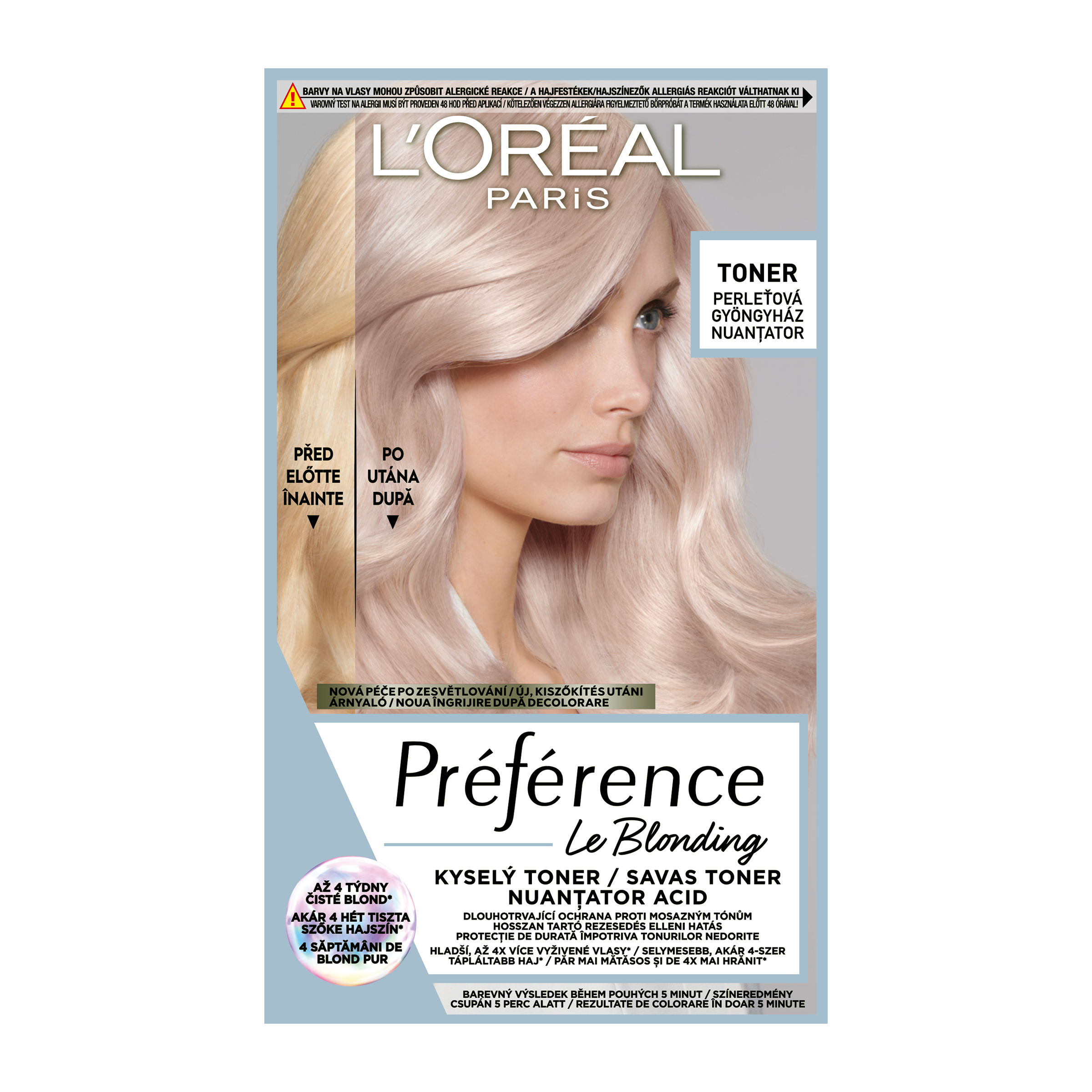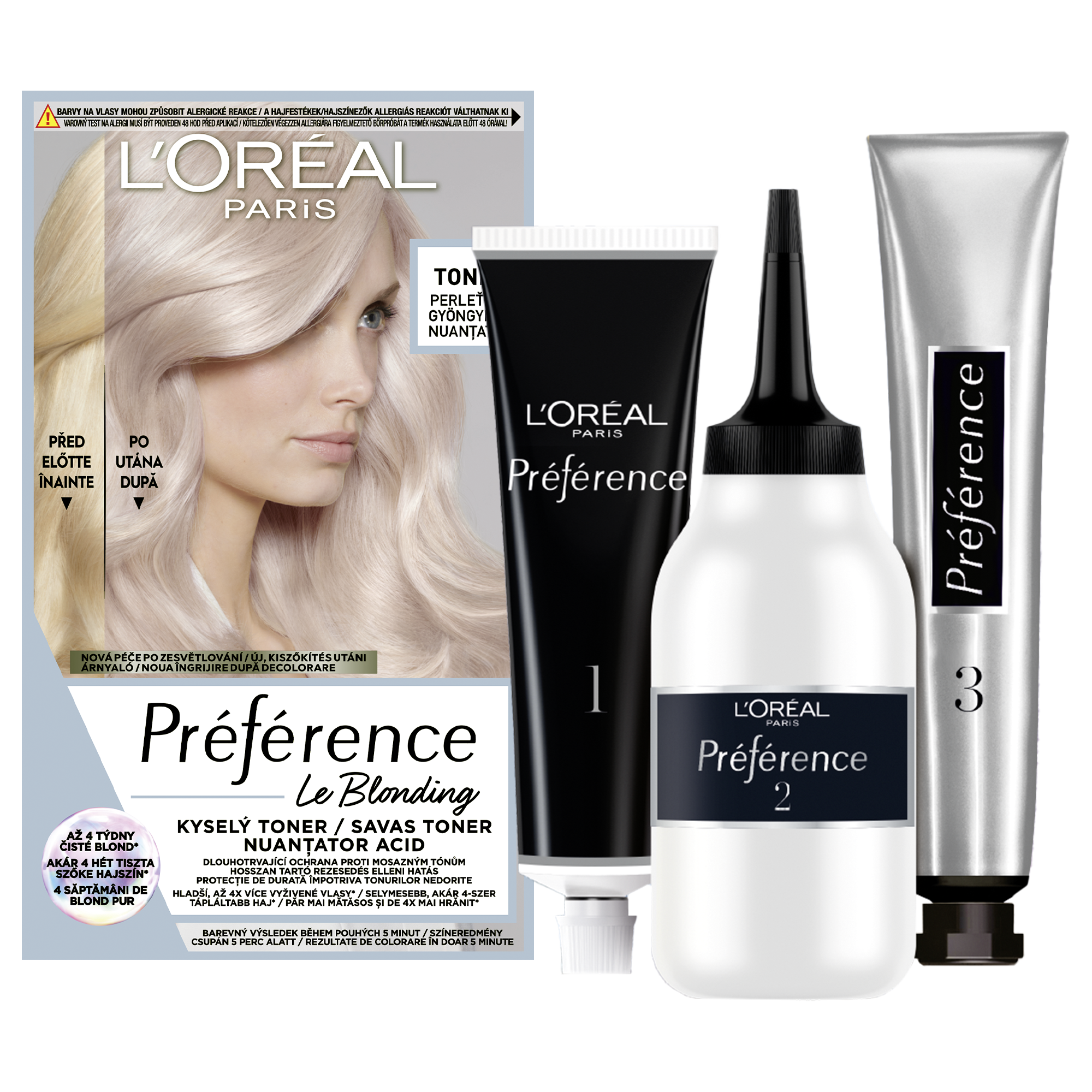 Dlouhotrvající ochrana proti mosazným tónům bez amoniaku. L'Oréal Paris Préférence přináší nově dlouhotrvající ochranu proti mosazným tónům, díky které jsou vlasy hladší a až 4x více vyživěné*. Jak Kyselý toner působí? Po absolvování odbarvení se pH vlasů stává zásaditým. To může vést k mdlým a porézním vlasům. Kyselý toner Préférence pomáhá obnovovat rovnováhu pH vlasů pro jeho přirozený rozsah a napomáhá tak zachovat vlasy kvalitní, vyživené a hebké. Efektivně neutralizuje nechtěné oranžové a žluté tóny pro ultra čistou blond barvu, která vydrží až 4 týdny*.