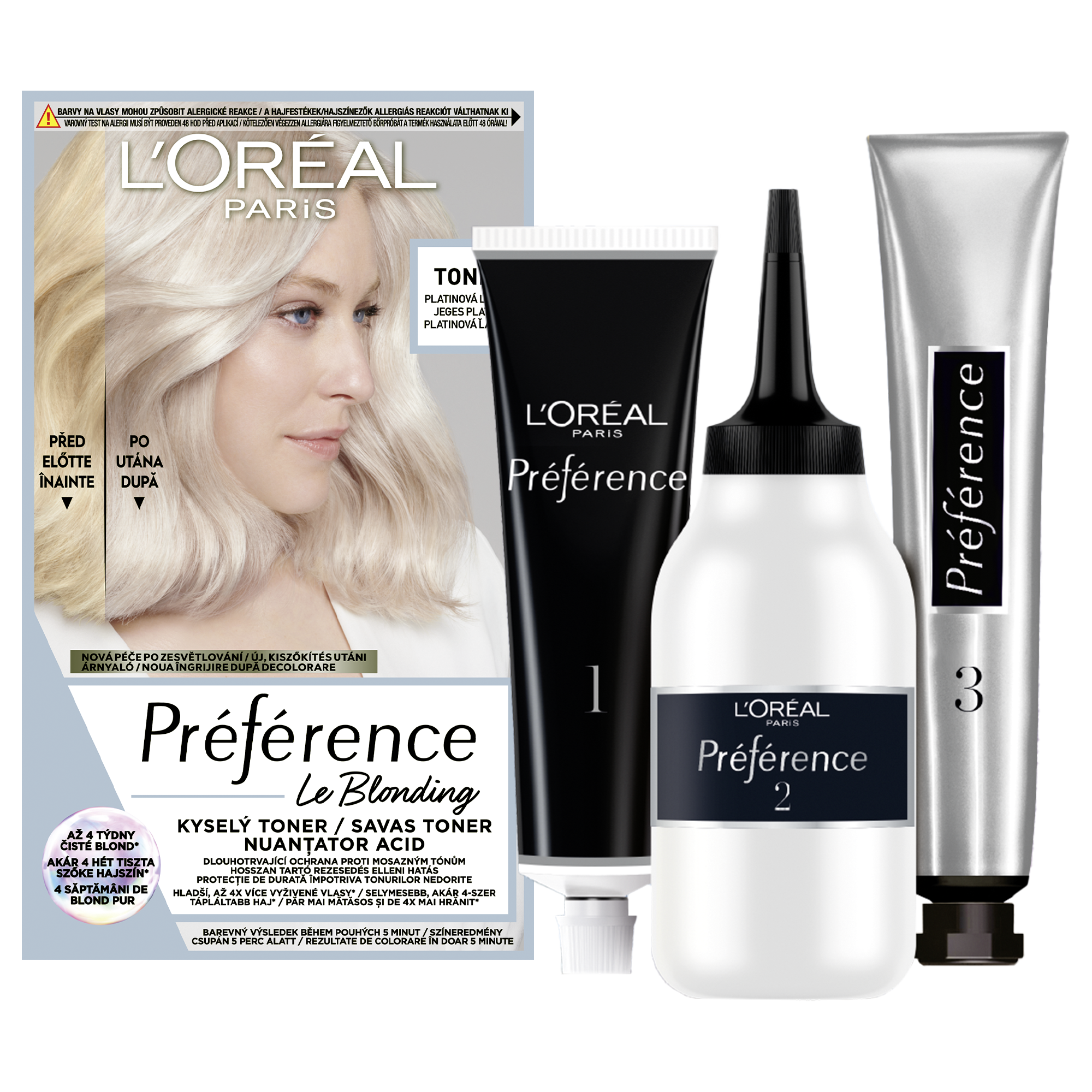 Dlouhotrvající ochrana proti mosazným tónům bez amoniaku. L'Oréal Paris Préférence přináší nově dlouhotrvající ochranu proti mosazným tónům, díky které jsou vlasy hladší a až 4x více vyživěné*. Jak Kyselý toner působí? Po absolvování odbarvení se pH vlasů stává zásaditým. To může vést k mdlým a porézním vlasům. Kyselý toner Préférence pomáhá obnovovat rovnováhu pH vlasů pro jeho přirozený rozsah a napomáhá tak zachovat vlasy kvalitní, vyživené a hebké. Efektivně neutralizuje nechtěné oranžové a žluté tóny pro ultra čistou blond barvu, která vydrží až 4 týdny*.