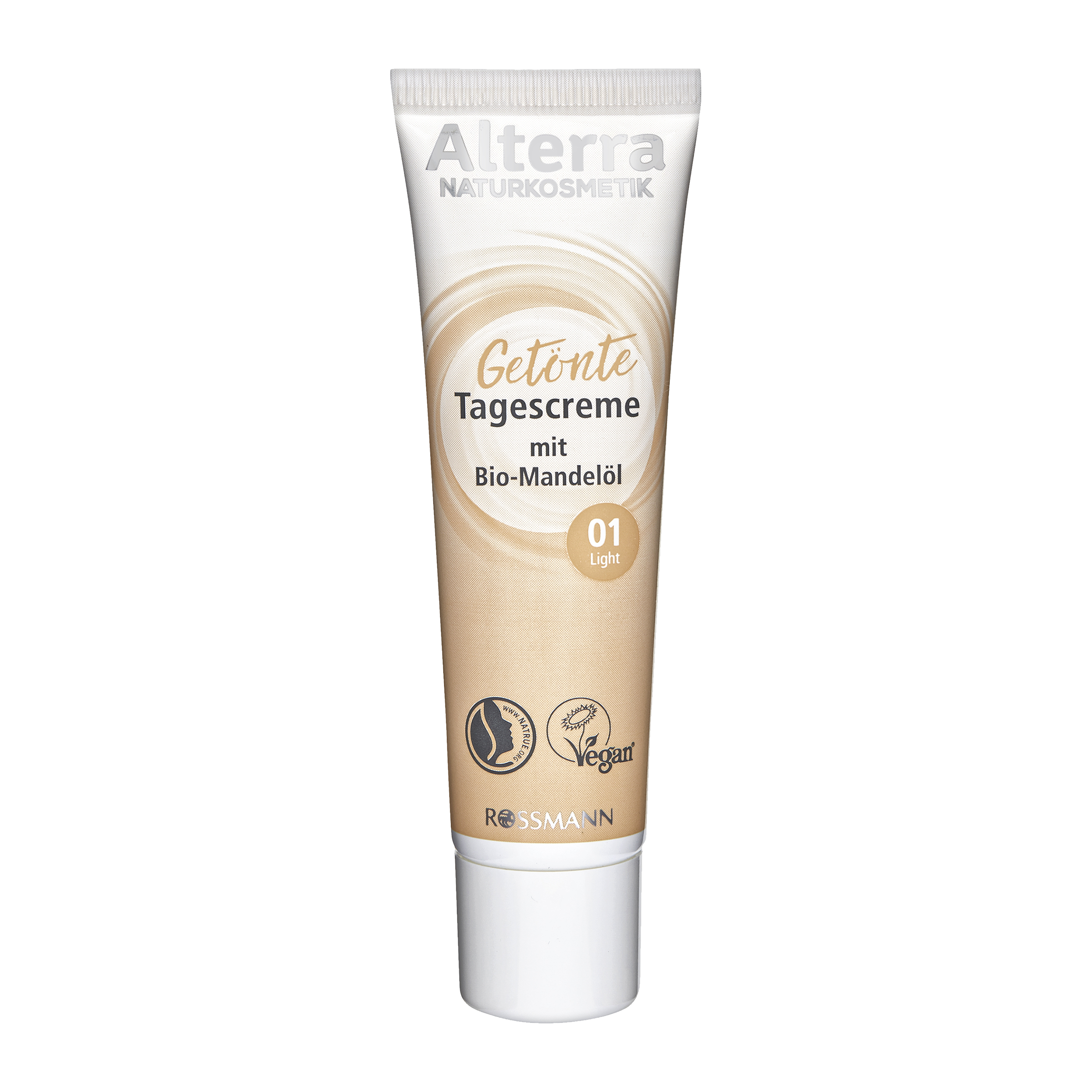 Tónovací denní krém Alterra s organickým mandlovým olejem a organickým bambuckým máslem poskytuje přirozený výsledek díky lehkému krytí, opticky vyhlazuje jemné vrásky a zároveň hydratuje.
