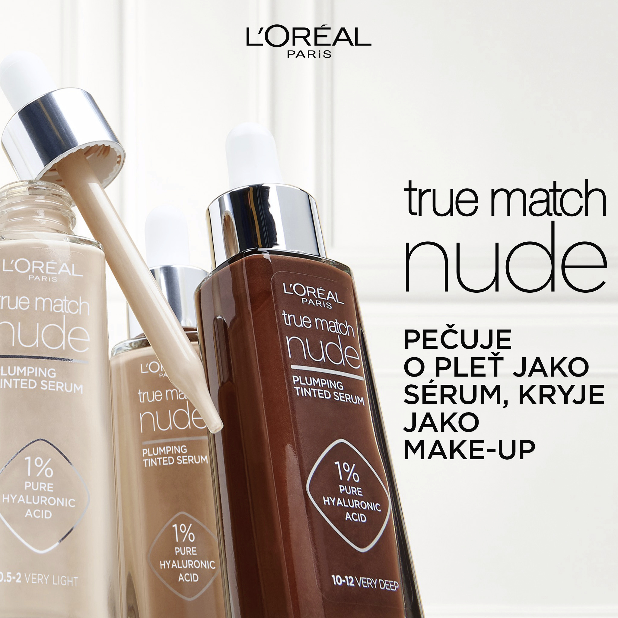 L'Oréal Paris představuje své první tónující sérum s 1% čisté kyseliny hyaluronové a s krytím jako make-up. Sérum proniká hluboko do pokožky a pleť intenzivně vyživuje, hydratuje a zajišťuje ten nejpřirozenější výsledek. Jedinečné spojení make-upu a pleťové péče tak okamžitě sjednotí, projasní a zjemní váš vzhled už po 3 týdnech užívání.