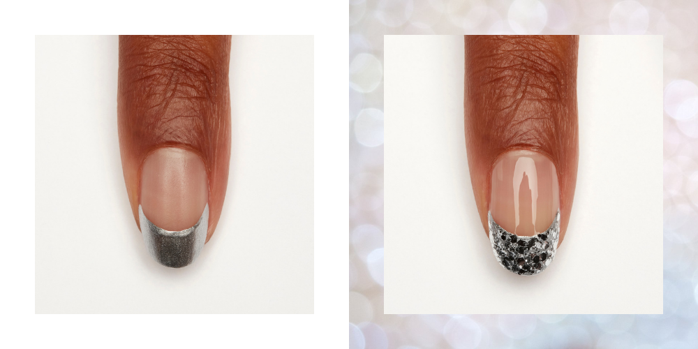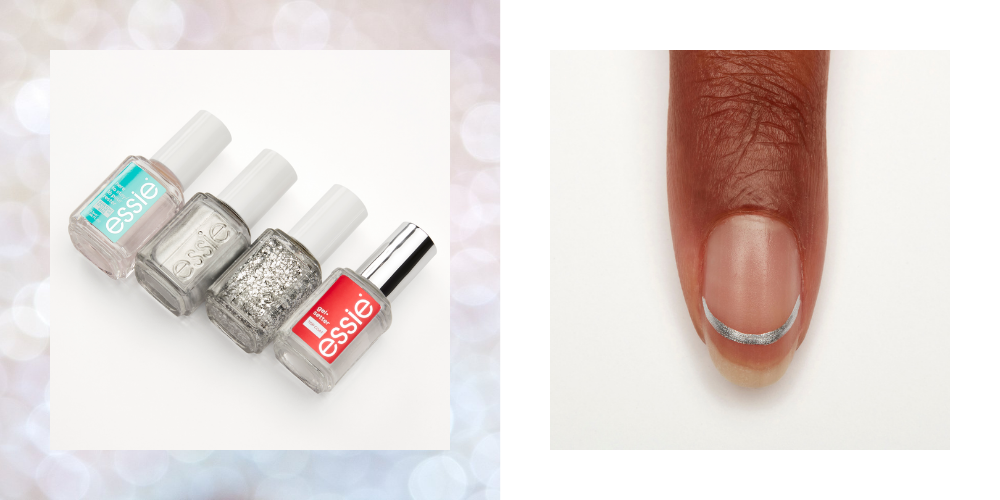 Tahle manikúra doslova nahradí šperk a stříbrné odstíny se skvěle hodí po celou zimu. Navíc v této variantě nebudou působit přehnaně a dodají slavnostní nádech každému dni. Nehty vždy prvně ošetřete a těsně před aplikací laků odmastěte – ideálně je lehce přejeďte odlakovačem, aby mohla manikúra dokonale přilnout. Pokud se ale bojíte, že by jakýkoli lak nehty obarvil sáhněte po podkladovém laku essie here to stay, který vaše nehty ochrání a dodá jim lesk. Poté co pokladový lak zaschne naneste do přibližně 1/3 odstín z exkluzivní kolekce rumor jazz it v metalické stříbrné essie all you ever beaded, který vytvoří dokonalý podklad pro třpytky z laku essie set in stone. Třpytky nanášejte spíše ťupkáním než tažením štětce – lépe se na nehet přenesou. Po zaschnutí barevných laků celou manikúru zafixujte a dodejte ji extra lesk a gelový efekt pomocí vrchního laku essie gel setter. Opět nezapomínejte i na hrany nehtů.