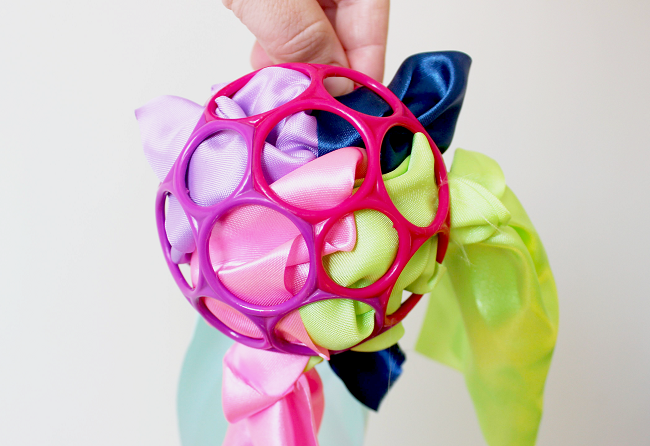 Do míčku (nebo jiného předmětu), který má v sobě dostatek otvorů vložte pestrobarevné ústřižky látek nebo stužek, které doma najdete. Čím barevnější a různorodější náplň bude, tím větší prostor pro zkoumání malému badateli dopřejete.