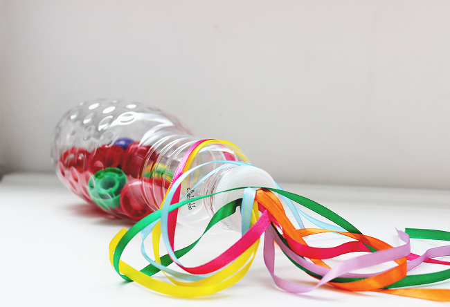 Do víčka od lahve, kterou jste pasovali na chrastítko, udělejte nůžkami dírku, kterou provléknete pestré stužky. Pak už stačí jen na vnitřní straně víčka všechny stužky zavázat dohromady na pevný uzlík, aby je děťátko nemohlo vyvléknout.