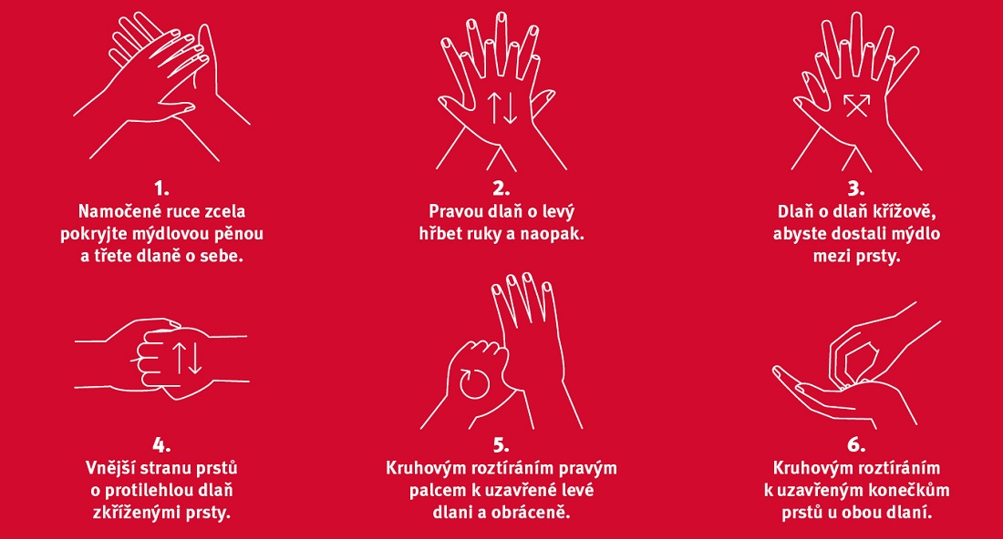 - Omyjte kruhovým pohybem palec pravé ruky v uzavřené levé dlani. Postup opakujte s druhou rukou.