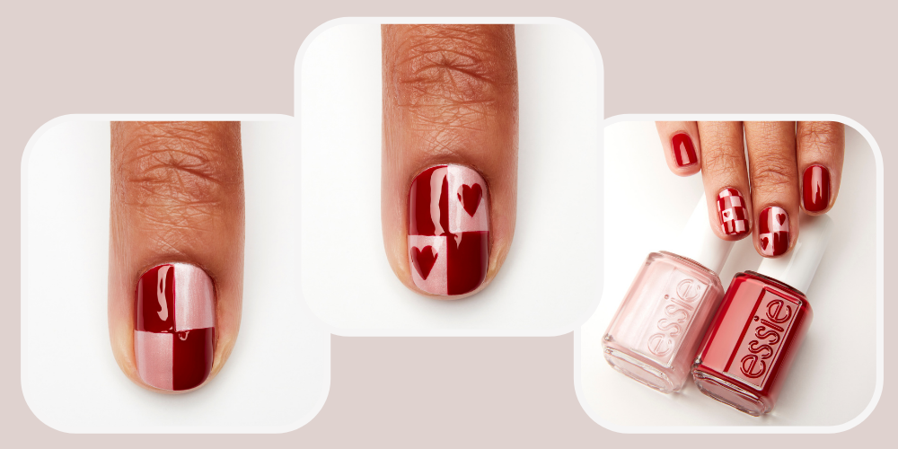 Prvním krokem samotné manikúry je pak podkladový lak essie strong start, který nehty díky obohacení o biotin i posilní. Po zaschnutí 1 vrstvy podkladového laku naneste na celé nehty metalickou růžovou pretty in ink. Nezapomínejte přelakovat i hrany nehtů. Po zaschnutí růžového podkladu si nehet pomocí úzkého štětečku a odstínu love note-worthy na maličkou šachovnici a 2 políčka vyplňte. Zbylá můžete nechat jen růžová nebo třeba vytvořit srdíčka – ideálně pomerančovým dřívkem si naneste 3 tečky do tvaru trojúhelníku a spojte je do srdíčkového tvaru.