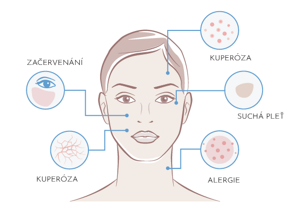 2. Rosacea (Růžovka) – objevuje se vám na kůži výrazné červené ohraničení? To způsobuje trvalý zánět kapilár. Má podobné příčiny jako kuperóza a řeší se péčí s obsahem měsíčku lékařského nebo zeleného čaje či laserovou operací kapilár.