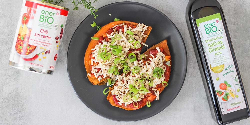 - Upečené batáty rozkrojte napůl, přidejte směs chilli sin carne a posypejte strouhaným tofu a jarní cibulkou.