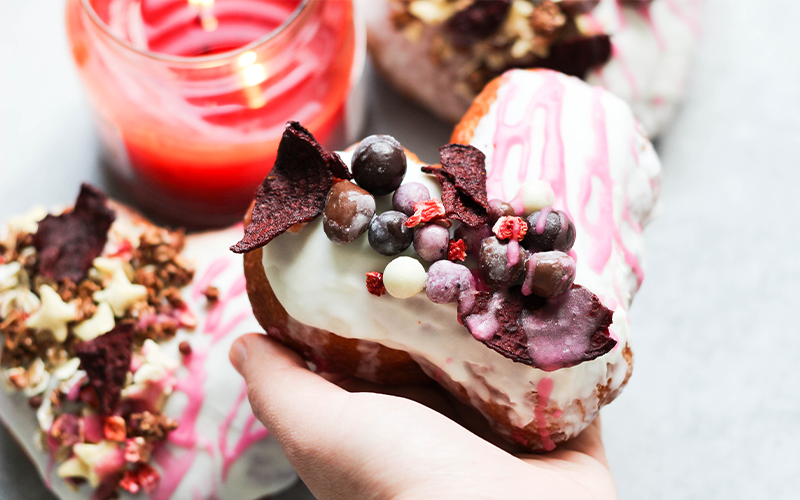 - Hotové donuty zdobíme dle libosti rozpuštěnou čokoládou (dle chuti mléčná, bílá, hořká), granolou s ledními plody, višněmi v bílé čokoládě s v jogurtu, lístky červené řepy či špaldovými srdíčky.