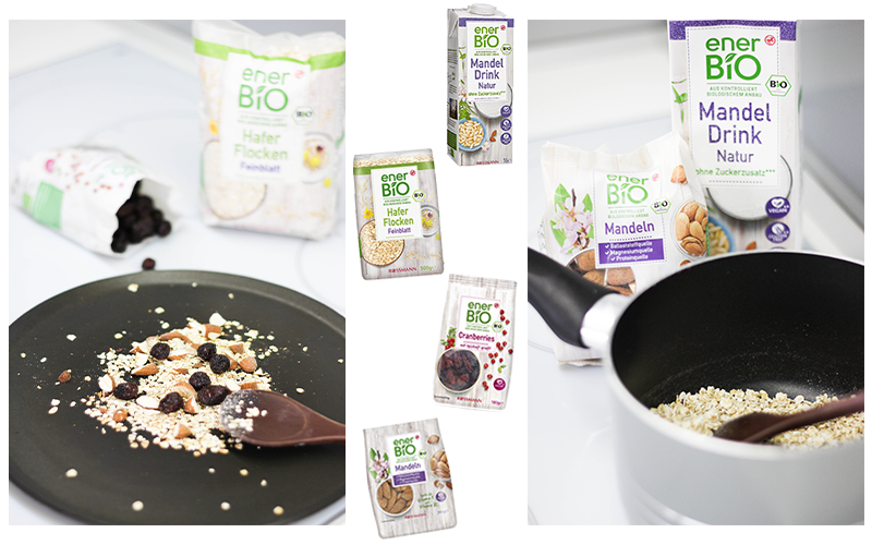 - Mezitím si nasekáme mandle, které krátce (do rozvodnění) orestujeme spolu s menší hrstičkou ovesných vloček a brusinkami na pánvi. Na závěr přidáme do této směsi lžičku medu a stáhneme z plamene. Směs nám lehce zkaramelizuje a stane se křupavou.