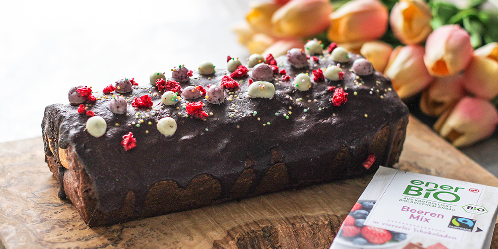 6. Upečený biskupský chlebíček ještě polijeme roztopenou hořkou čokoládou smíchanou s kokosovým olejem (díky kokosovému oleji bude poleva lesklejší) a ozdobíme ovocnými kuličkami v čokoládě, barevným posypem a lyofilizovanými malinami.