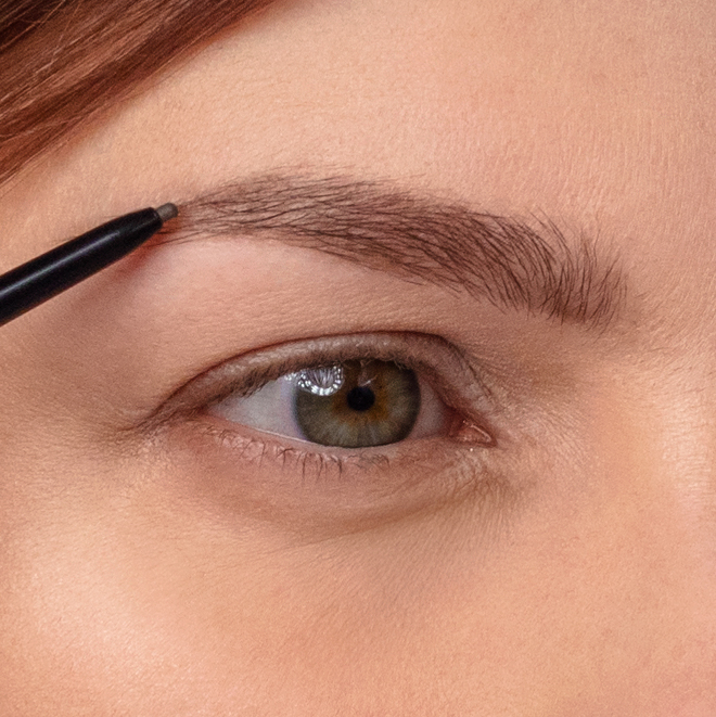 Prvním krokem je vykreslení a upravení obočí. Lucie používá tužku Brow Ultra Slim, se kterou jemnými tahy doplní chybějící chloupky a upraví tvar obočí. Kartáčkem na druhé straně potom můžete obočí pročesat pro přirozený efekt.