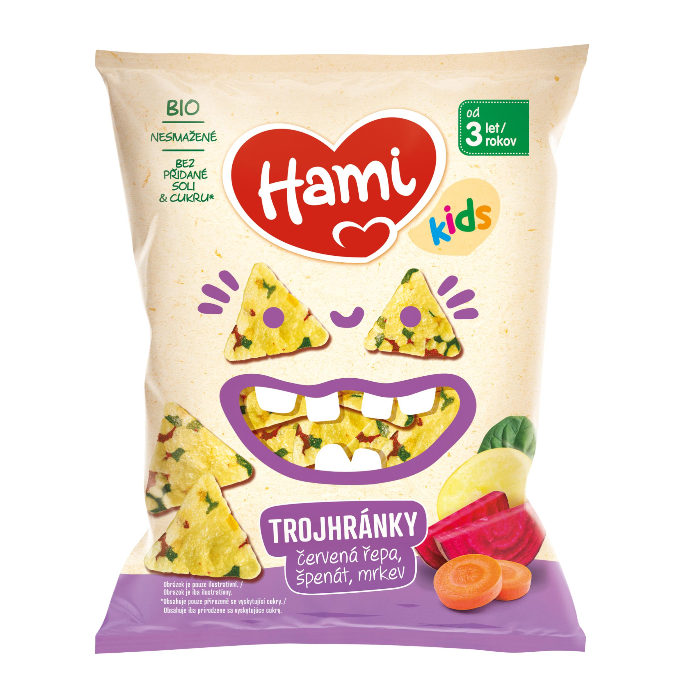 Trojhránky od Hami jsou ideální svačinkou pro předškoláky. Tyto křupavé trojúhelníčky jsou vyráběné z kvalitních BIO surovin a jsou nesmažené, díky čemuž jsou zdravější alternativou ke klasickým bramborovým lupínkům. S příchutí červené řepy, mrkve a špenátu představují nejen chutnou, ale i nutričně bohatou svačinku pro děti.
