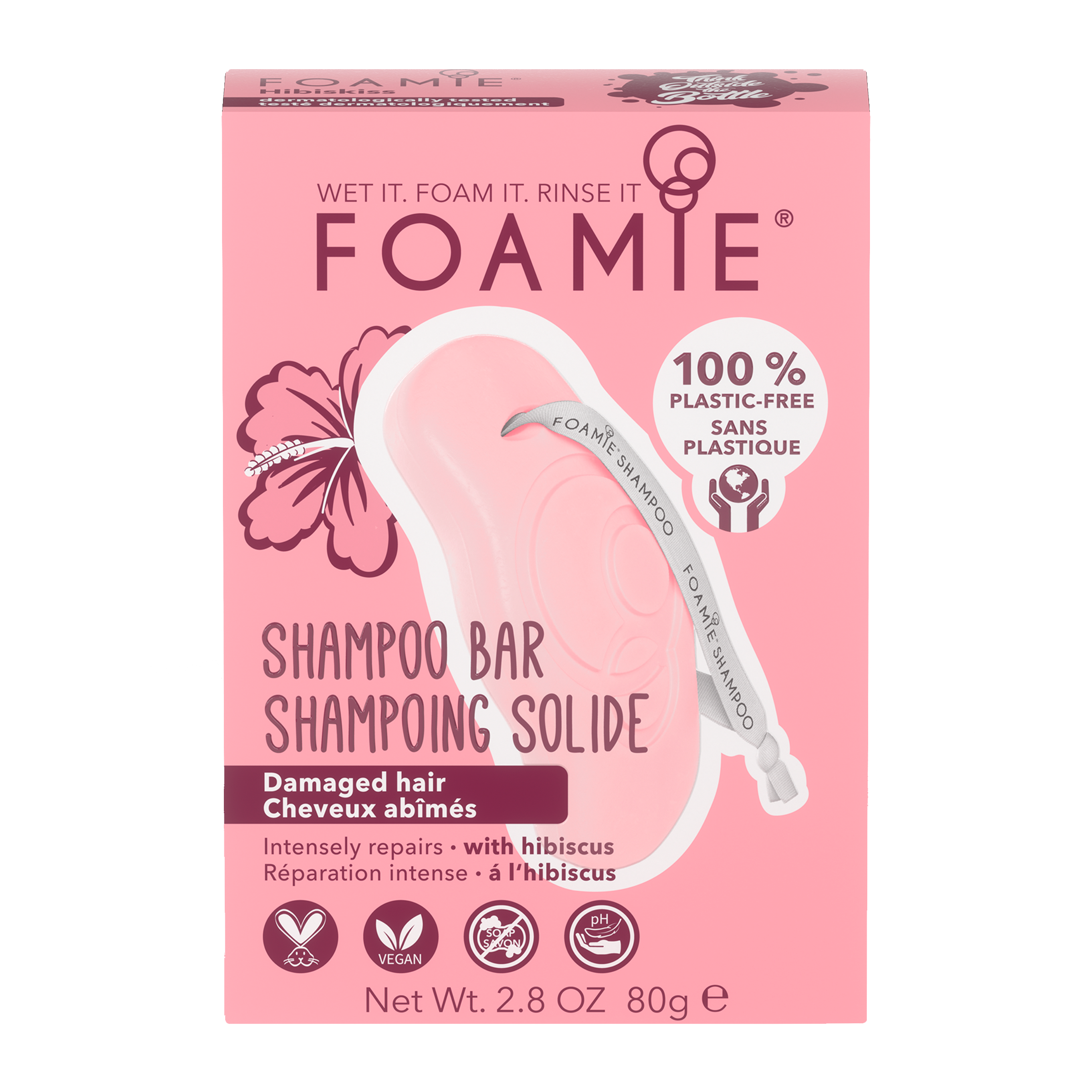 Tuhý šampon s přirozeným pH, který jemně a šetrně pečuje o poškozené vlasy s extraktem z ibišku a kopřivy. Obsahuje pH neutrální složky, které se přizpůsobí vlasům a pokožce hlavy. Vydrží až 25 umytí. Veganský a netestovaný na zvířatech a také bez silikonů, parabenů, barviv, sulfátů a mikroplastů. Hypoalergenní a dermatologicky testován.