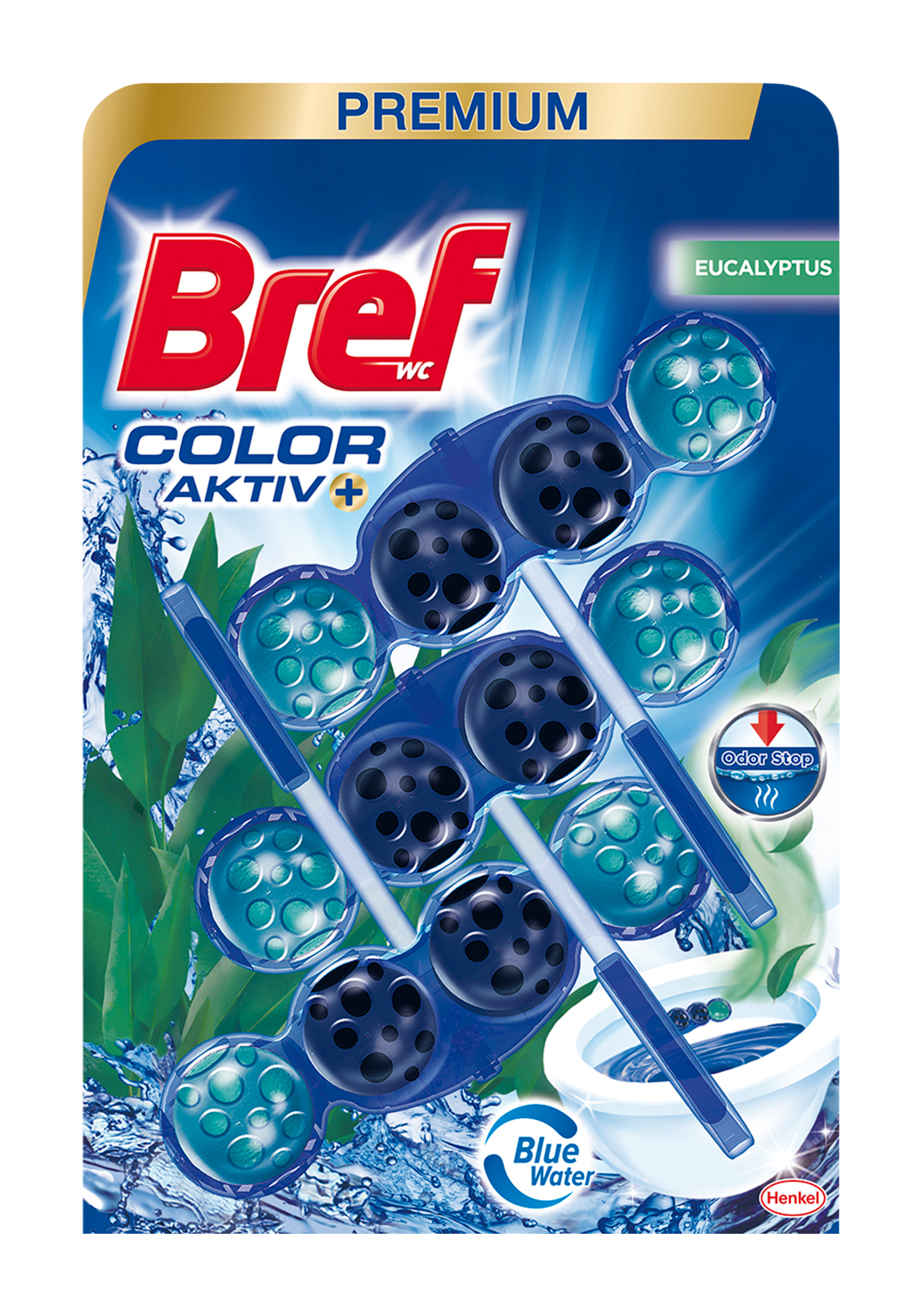 Bref Color Aktiv WC blok s vůní eukalyptu a technologií Odor Stop Bref Color Aktiv WC blok s technologií Odor Stop vytváří ochrannou bariéru proti nepříjemným zápachům a zároveň uvolňuje dlouhotrvající svěžest. Zažijte neutralizaci zápachu po každém spláchnutí s přidanou hodnotou vůně eukalyptu. Viditelné čištění je zajištěno vodou zabarvenou do modra a vaši toaletu provoní dlouhotrvající vůně eukalyptu. Bref Color Aktiv WC blok má složení se 4 funkcemi: