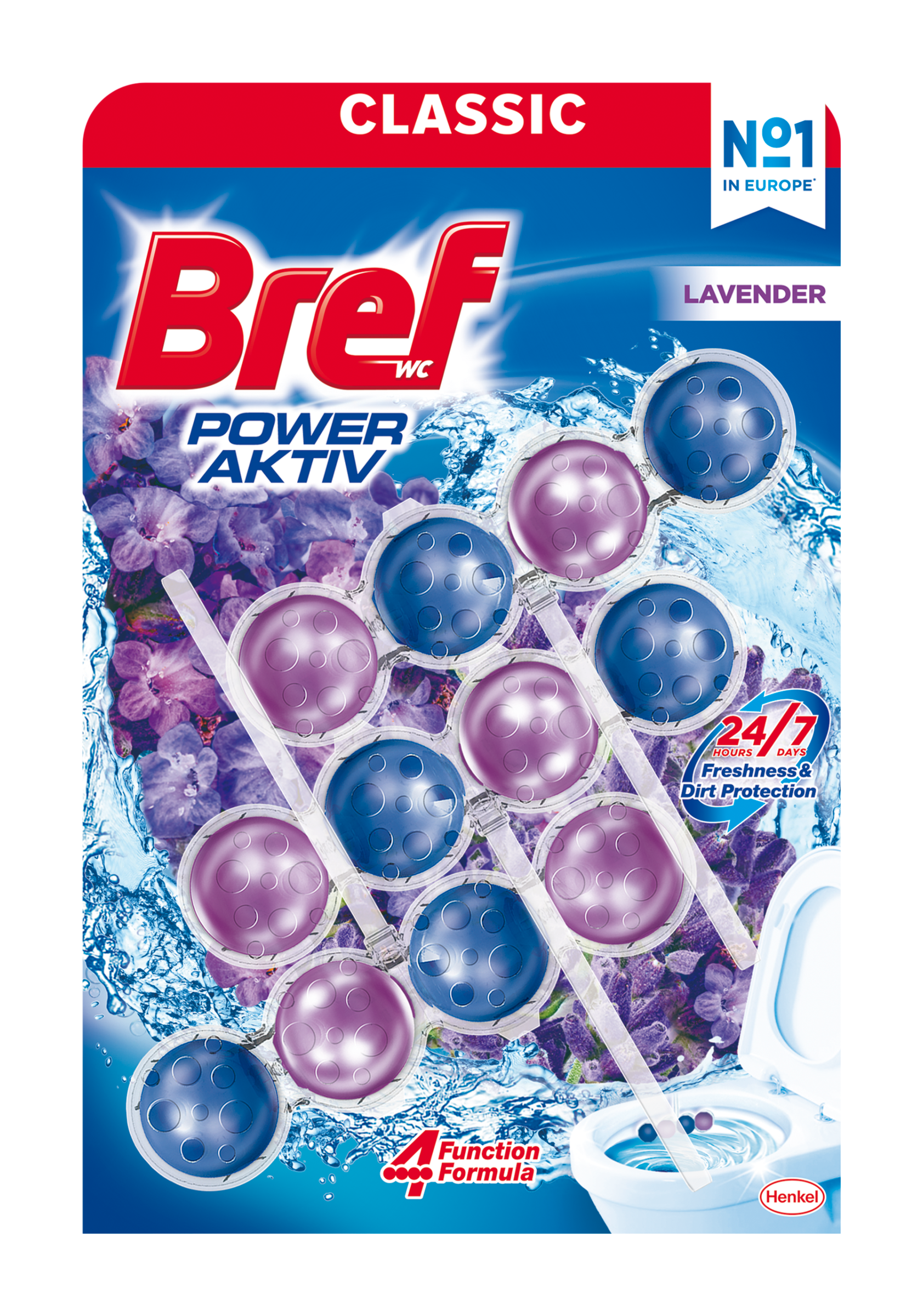 Hledáte jednodušší způsob, jak udržet vaši toaletu čistou a svěží? Bref WC blok je snadný a pohodlný způsob, který zajišťuje čistotu a svěžest ve vaší toaletě od prvního do posledního spláchnutí. Bref Power Aktiv WC blok má složení se 4 funkcemi: 1) Čisticí pěna čistí toaletu s každým spláchnutím. 2) Ochrana před vodním kamenem zabraňuje tvorbě vodního kamene v toaletě. 3) Ochrana proti nečistotám zabraňuje jejich usazování. 4) Extra svěžest zanechává dlouhotrvající svěží vůni v koupelně. Bref Power Aktiv nyní přichází také s technologií osvěžovače vzduchu, která zajišťuje, že bude vaše koupelna plná svěží vůně do posledního spláchnutí. Jednoduše zavěste WC blok pod okraj toaletní mísy a nasměrujte do proudu vody. Jakmile je toaleta spláchnuta, zažijete v koupelně čistotu a svěžest levandule. Pro recyklaci oddělte karton od plastového obalu.